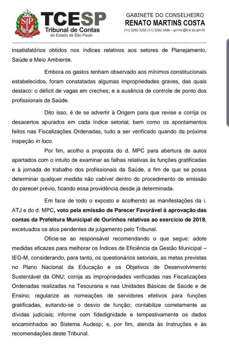 “Oficie-se ao responsável recomendando o que segue: adote medidas eficazes para melhorar os Índices de Eficiência da Gestão Municipal – IEG-M, considerando, para tanto, os questionários setoriais, as metas previstas no Plano Nacional da Educação e os Objetivos de Desenvolvimento Sustentável da ONU; corrija as impropriedades verificadas nas Fiscalizações Ordenadas realizadas na Tesouraria e nas Unidades Básicas de Saúde e de Ensino; regularize as nomeações de servidores efetivos para funções gratificadas, evitando-se o desvio de função; contabilize corretamente as dívidas judiciais; informe com fidedignidade e tempestivamente os dados encaminhados ao Sistema Audesp; e, por fim, atenda às Instruções e às recomendações deste Tribunal”.