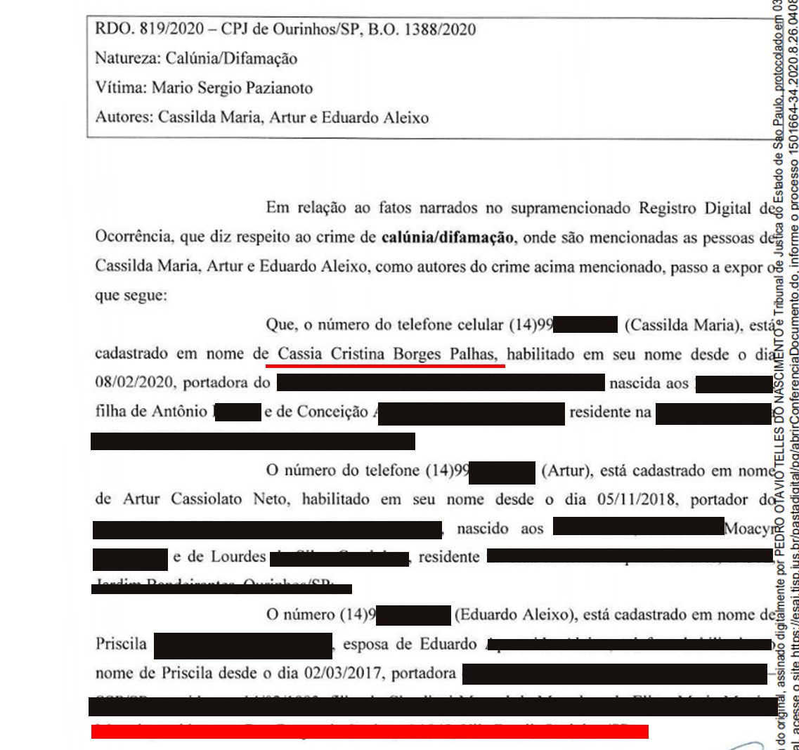 No boletim, Sargento Sérgio aponta três números como autores das supostas “Fake News” e, um dos números, de uma pessoa que se apresentava como "Cassilda Maria”, os investigadores descobriram que está cadastrado no nome de Cássia Cristina Borges Palhas, ou seja, da secretária de Saúde. Como é possível comprovar pelo documento abaixo: