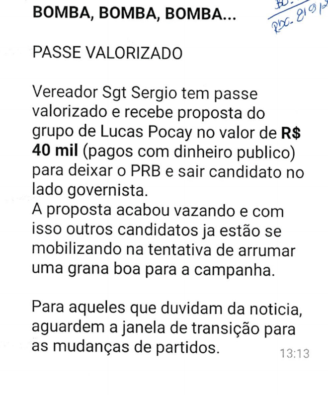 O Passando a Régua teve acesso ao TC (Termo Circunstanciado), que foi feito pelo NECRIM (Núcleo Especial Criminal de Ourinhos). De acordo com o documento, o fato teria ocorrido no dia 30 de março de 2020, quando em um grupo de WhatsApp de nome "A voz do povo", foram postadas noticiais suspostamente falsas, que diziam que o vereado Sargento Sérgio teria recebido uma proposta de R$ 40 mil, pagos com dinheiro público, de pessoas ligadas ao atual prefeito Lucas Pocay (PSD), para que ele mudasse de partido, indicando que Sérgio estaria praticando corrupção.