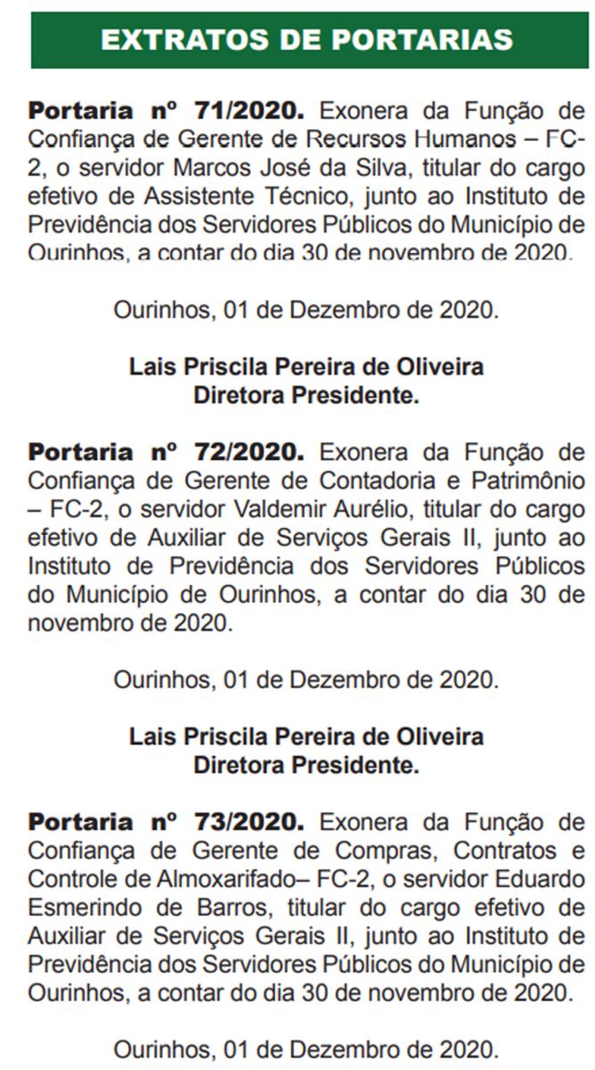 Portaria nº 74/2020. Exonera da Função de Confiança de Gerente de Benefícios e Controle de Expediente– FC-2, o servidor Antonio Francisco Robles, titular do cargo efetivo de Secretário Escolar, junto ao Instituto de Previdência dos Servidores Públicos do Município de Ourinhos, a contar do dia 30 de novembro de 2020.