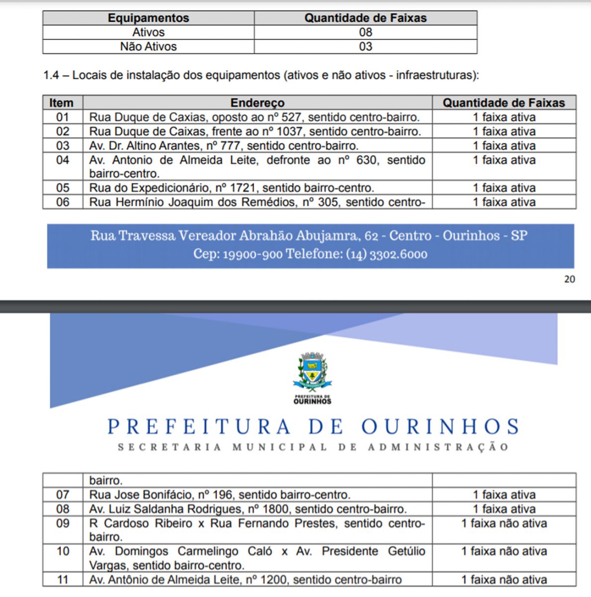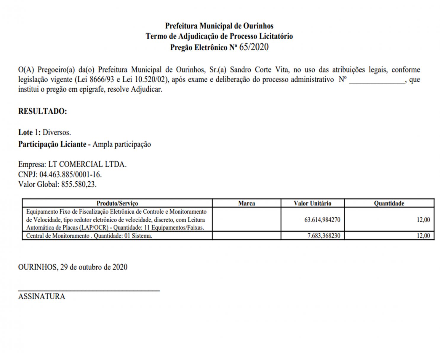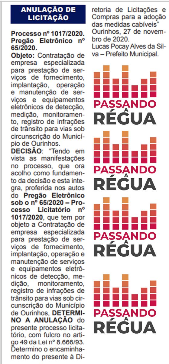 A prefeitura de Ourinhos publicou na noite desta terça-feira, 1, no Diário Oficial do Município, a anulação do novo Pregão Eletrônico, nº 65, para contratação de empresa especializada para prestação de serviços de fornecimento, implantação, operação e manutenção de serviços e equipamentos eletrônicos de detecção, medição, monitoramento, registro de infrações de trânsito para vias sob circunscrição do município de Ourinhos.