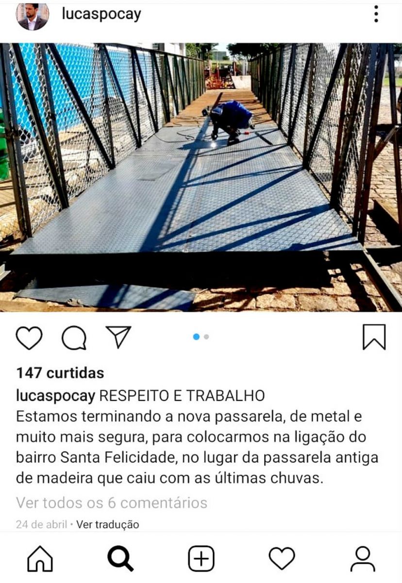 No último dia 24 de abril, duas semanas após a ponte de madeira ser levada pela enxurrada, o prefeito de Ourinhos, Lucas Pocay (PSD), chegou a anunciar em suas redes sociais que uma nova ponte, “agora de metal e mais segura”, estava sendo finalizada para ser instalada.
