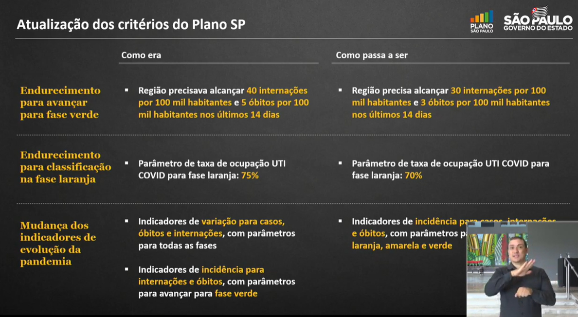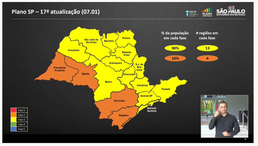 O governo João Doria (PSDB) havia adiado a reclassificação das regiões do Plano São Paulo, de reabertura econômica e flexibilização da quarentena, desta quinta-feira para hoje (8). Um dos motivos do adiamento foi a realização de uma outra coletiva de imprensa estadual que divulgou os resultados dos testes realizados no Brasil da vacina CoronaVac.