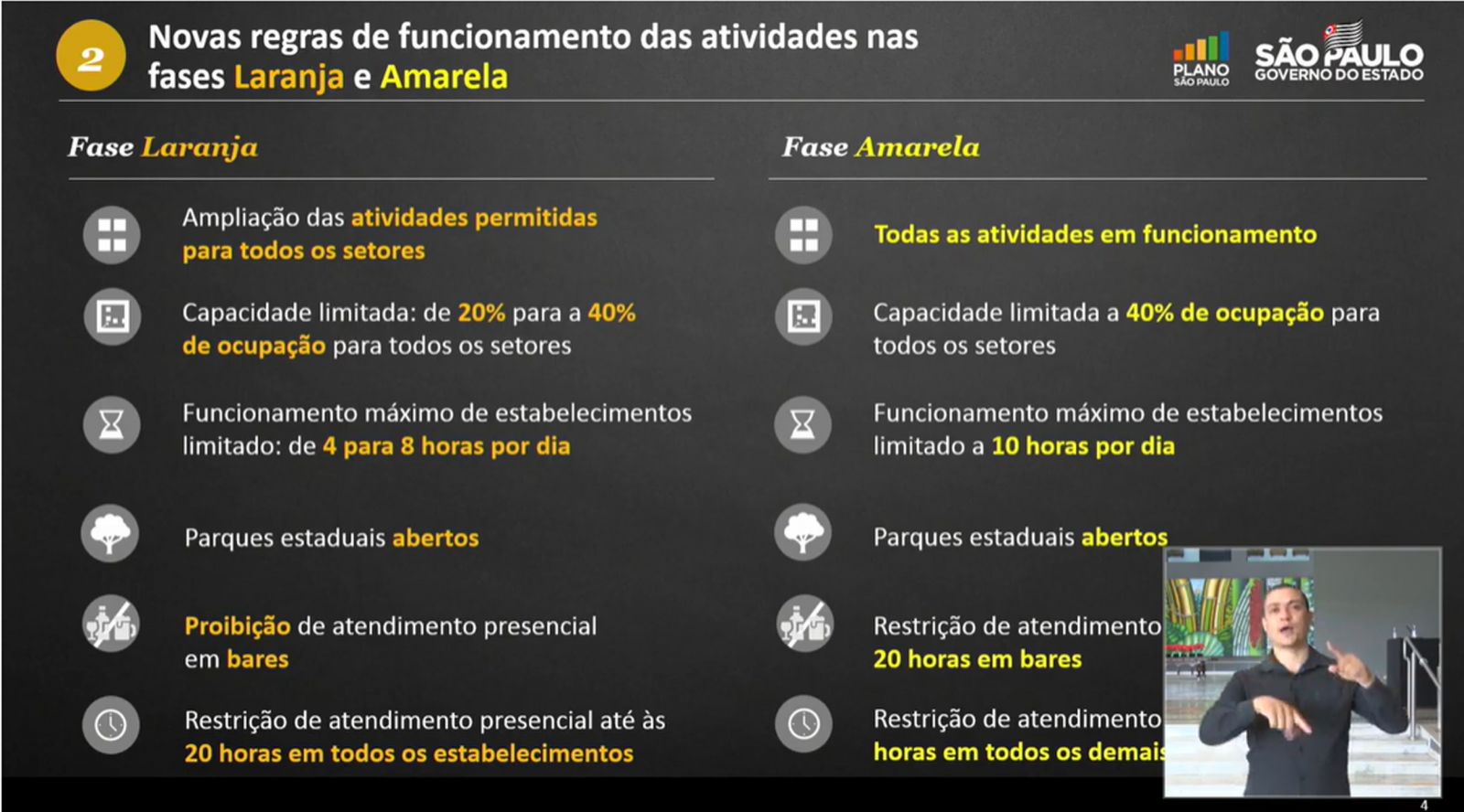 Somente quatro regiões estão na fase Laranja; Marília, Presidente Prudente, Registro e Sorocaba. Nesta fase ficou definido que são permitidos funcionar todos setores que estavam funcionando na fase amarela, inclusive eventos culturais poderão acontecer. Mas o funcionamento total terá que ser de no máximo 8h e o limite de atendimento ao público até ás 20h. Bares não poderão fazer atendimento presencial.