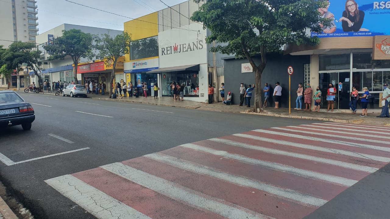 Enquanto as praças estão interditadas, a poucos metros as pesssoas se aglomeram na fila da agência da Caixa Econômica Federal.