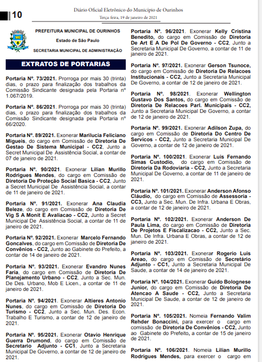 Após exonerar mais de 70 cargos comissionados, no começo de janeiro, o prefeito Lucas Pocay (PSD) voltou a encher a Prefeitura com “apaniguados” e, em pleno caos da pandemia da Covid-19, publicou nesta terça-feira, 19, no Diário Oficial do Município, novas 67 portarias de nomeações de cargo comissionados, que receberão salários que variam de R$4.200,00 (CC3), R$5.000,00 (CC2) até R$6.200,00 (CC1), sem contar os cargos dos secretários que recebem R$R$ 8.934,00, do vice-prefeito: R$ 8.934,00 e do próprio prefeito: R$ 16.850,00.