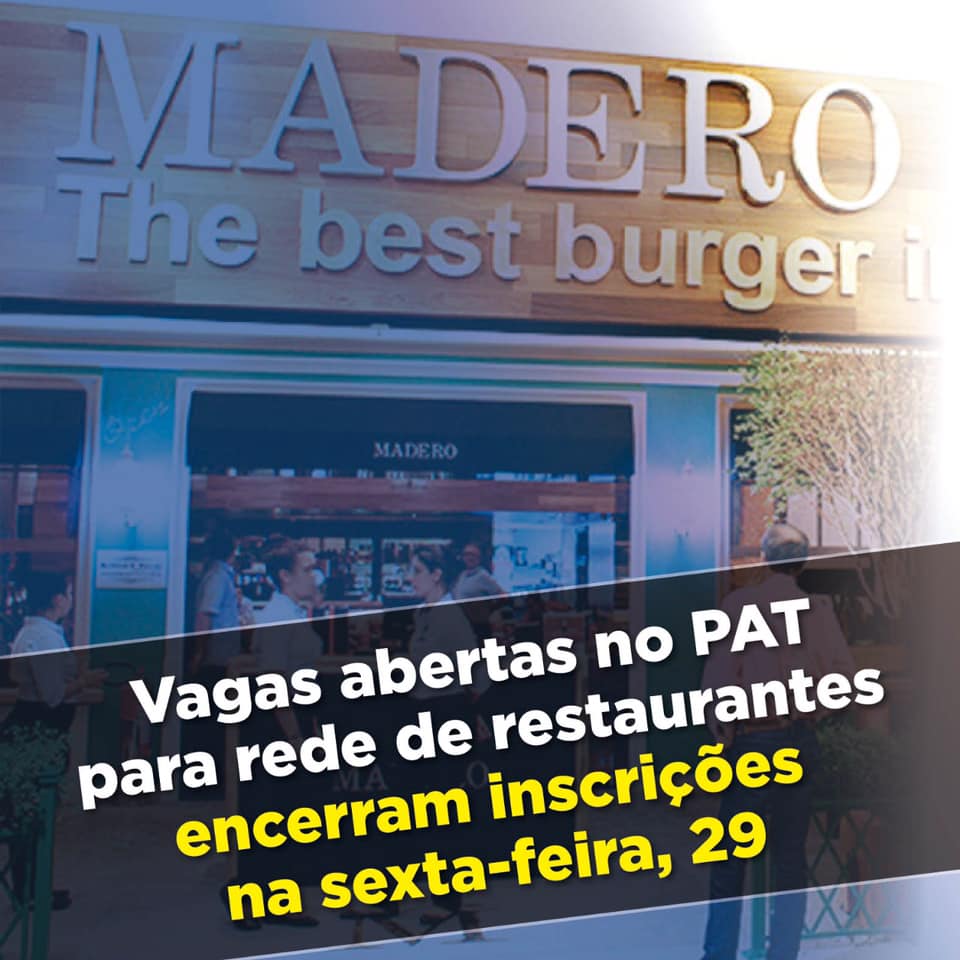 O PAT (Posto de Atendimento ao Trabalhador) de Ourinhos recebe até o dia 29 de janeiro as inscrições para as 65 vagas disponibilizadas para jovens entre 18 a 30 anos na rede de restaurantes Madero, com possibilidade de trabalhar em várias cidades do Brasil.