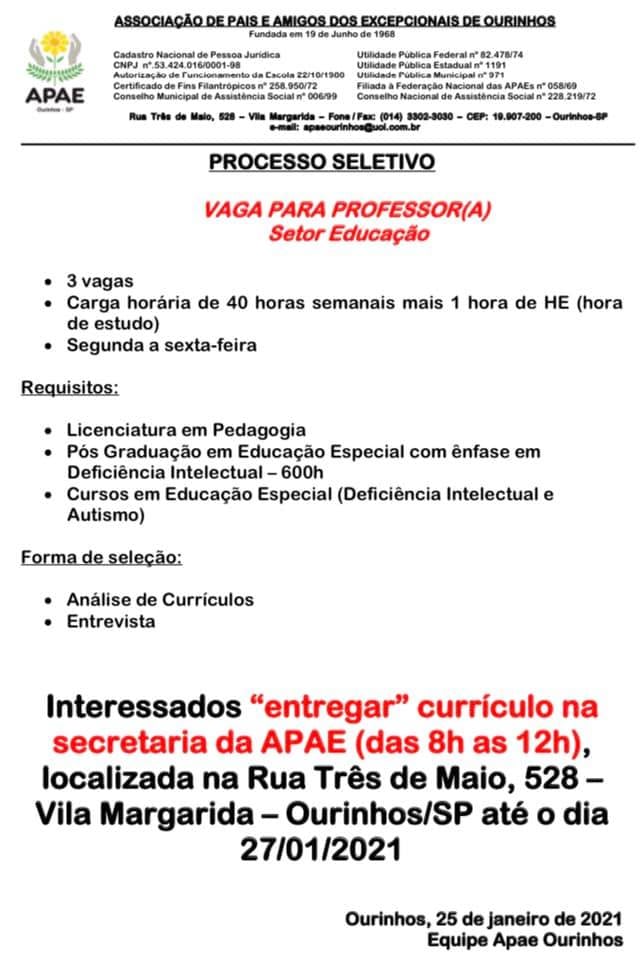 Interessados enviar currículo com foto no e-mail: recrutamentoapaeours@hotmail.com