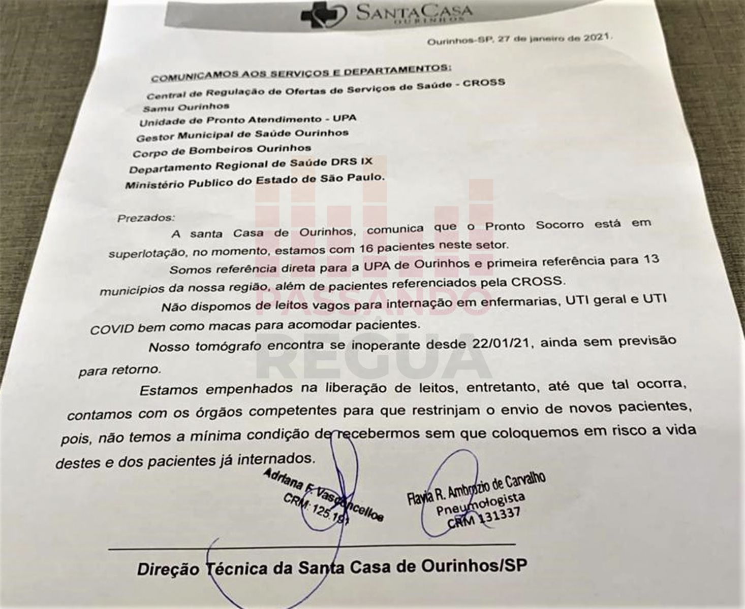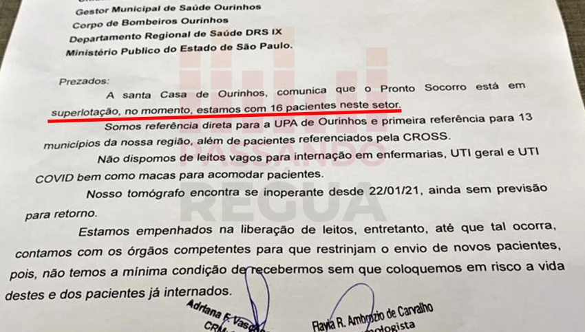 De acordo com o documento, a Santa Casa de Ourinhos, além de estar superlotada, também está sem aparelho de tomografia, que está quebrado, desde sexta-feira, 22.