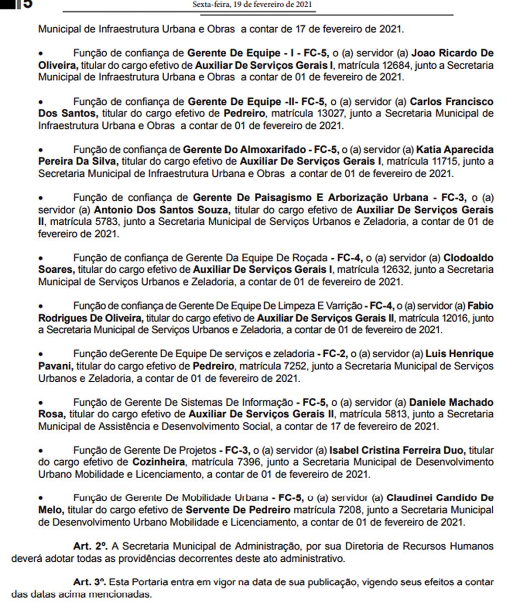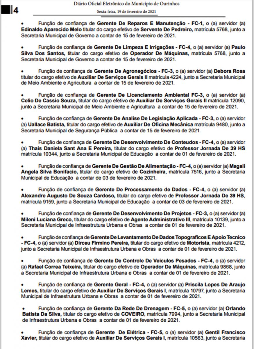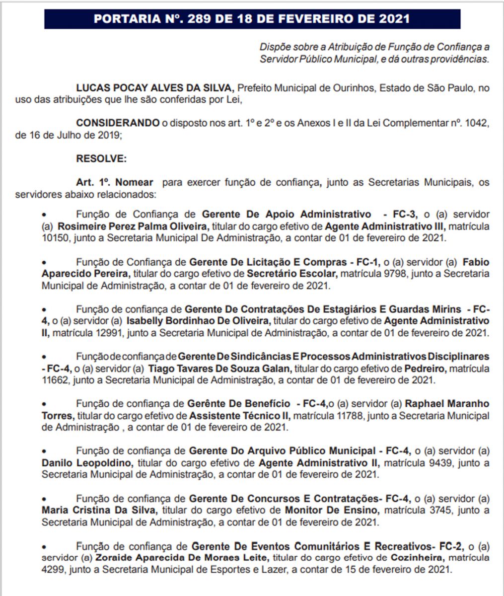 O prefeito de Ourinhos, Lucas Pocay (PSD), continua enchendo a Prefeitura de cargos de confiança e desta vez nomeou mais 37 FCs (Funções de Confiança), que são cargos que ampliam os ganhos de servidores efetivos, que recebem além dos seus salários, um acréscimo, dependendo do símbolo: (R$700,00/FC-5, R$1.000,00/FC-4, R$1.500,00/FC-3, R$2.000/FC-2 e R$3.000/FC-1). As portarias foram publicadas na edição Diário Oficial do Município, nesta sexta-feira, 19. Confira a relação dos nomeados abaixo: