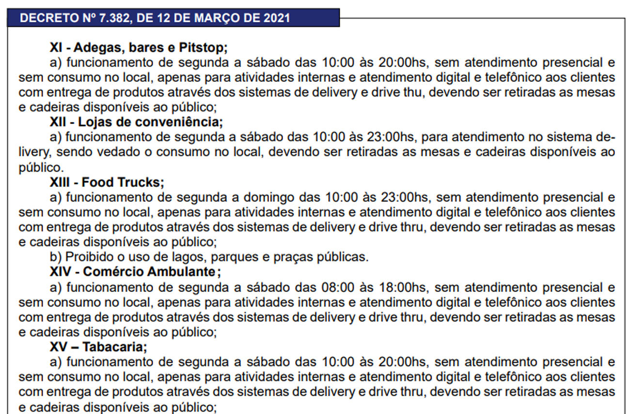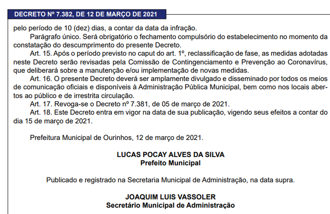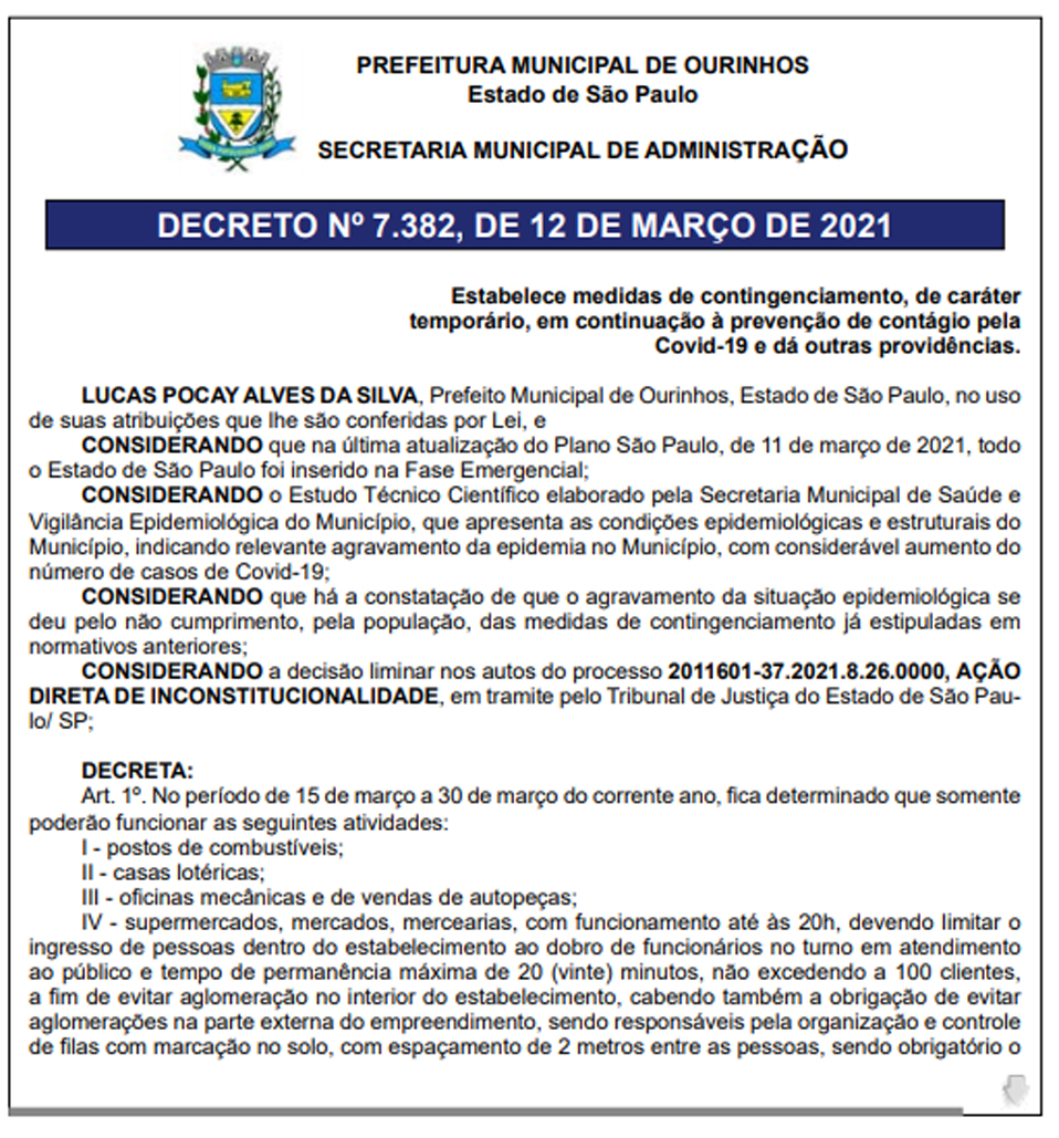 Demorou, mas o prefeito de Ourinhos Lucas Pocay (PSD), publicou na noite desta sexta-feira, 12, no Diário Oficial do Município, o Decreto nº 7.382, que estabelece medidas de contingenciamento, de caráter temporário, em continuação à prevenção de contágio pela Covid-19. O novo decreto endurece ainda mais a quarentena na cidade, afim que reduzir o contágio do vírus, que já matou até a última divulgação 122 pessoas na cidade. Entre as principais alterações é a retirada do sistema “Take Away”, que permitia o cliente buscar a mercadoria na porta do estabelecimento a pé. Agora só estão permitidos os sistemas delivery e drive-thru em serviços considerados não essenciais. Os horários de funcionamento dos estabelcimentos foram mantidos.