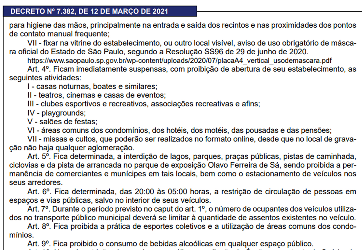 O prefeito ainda determinou a proibição de celebrações religiosas presenciais. Com isso as igrejas só poderão ficar abertas e receber fieis para orações, mas não para missas e cultos, que poderão ser realizadas e transmitidas on-line.