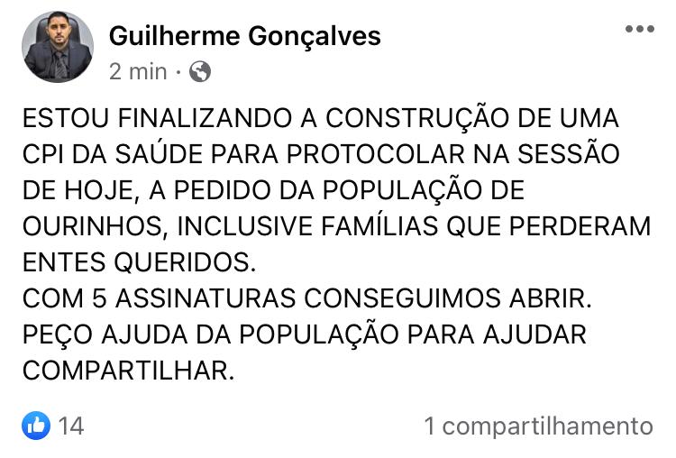 O vereador Guilherme Gonçalves (PODE) está pedindo o apoio popular para conseguir cinco assinaturas necessárias para instaurar a CPI (Comissão Parlamentar de Inquérito) da Saúde de Ourinhos, na Câmara Municipal. O intuito da CPI é investigar, como um todo, a destinação dos recursos financeiros direcionados ao entendimento da área da saúde na cidade, o que envolveria todos os equipamentos públicos - UPA (Unida de Pronto Atendimento), UBSs (Unidades Básicas de Saúde), Postão Central, Posto da Cohab, USFs (Unidades da Saúde da Família) e até mesmo o hospital de campanha, entre outros. (Confira o áudio do vereador acima)