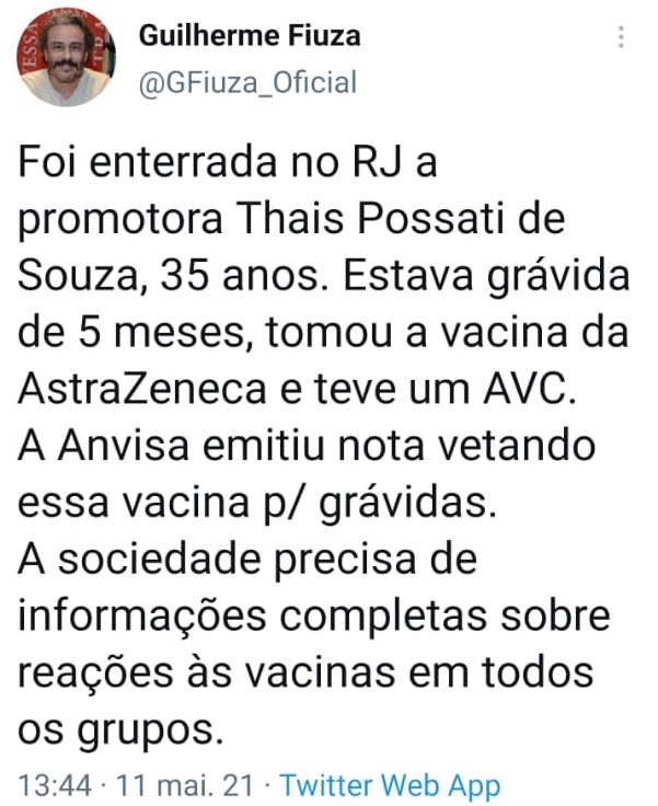 A medida anunciada hoje ocorreu após a pasta ter sido informada na última sexta-feira (7) do episódio de uma gestante que teria morrido após ter recebido a vacina Oxford/AstraZeneca. Trata-se da promotora Thaís Possati de Souza, que atuava no Rio de Janeiro e teve um AVC (Acidente Vascular Cerebral) após tomar o imunizante da AstraZeneca.