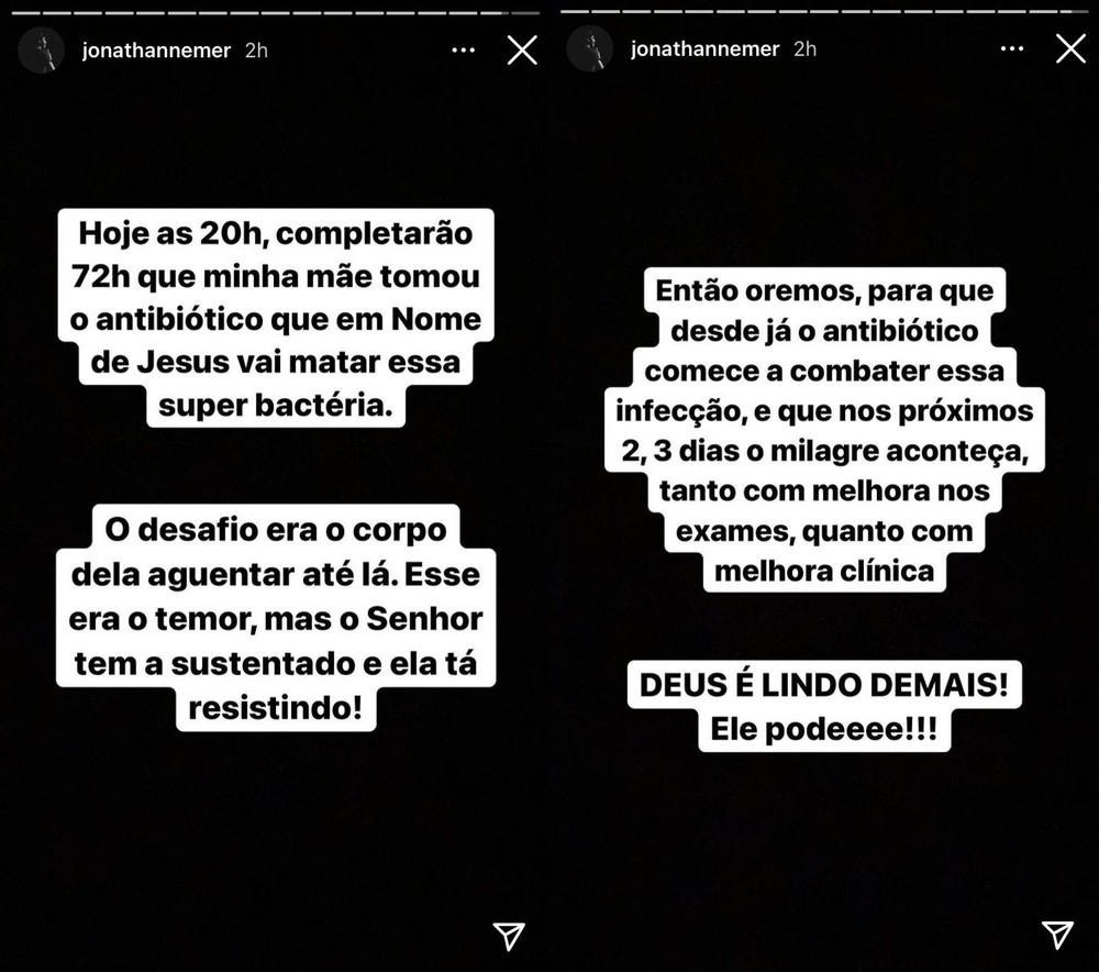 “Eu já tinha falado esses dias que minha mãe está com uma bactéria que é multirresistente, os antibióticos convencionais não conseguem matá-la e, desde sábado, começou a ser aplicado um antibiótico mais forte, mais potente. É como se fosse uma última cartada né? Mas eu conheço alguém que pode derrubar qualquer bactéria, qualquer infecção. Esse alguém é Jesus”, afirmou nas redes sociais.