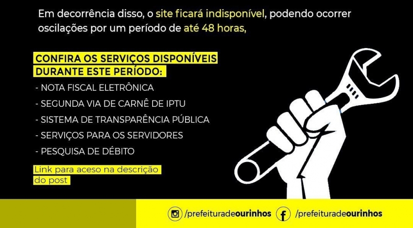 A Prefeitura de Ourinhos informou, na manhã desta quinta-feira, 20, que o seu site passará por manutenção técnica, nesta sexta-feira, 21, e poderá sofrer oscilações, mas os serviços de “nota fiscal eletrônica”, “segunda via de carnê de IPTU”, “sistema de transparência”, “serviços para os servidores”, “pesquisa de débito” ainda serão mantidos. Confira o comunicado abaixo: