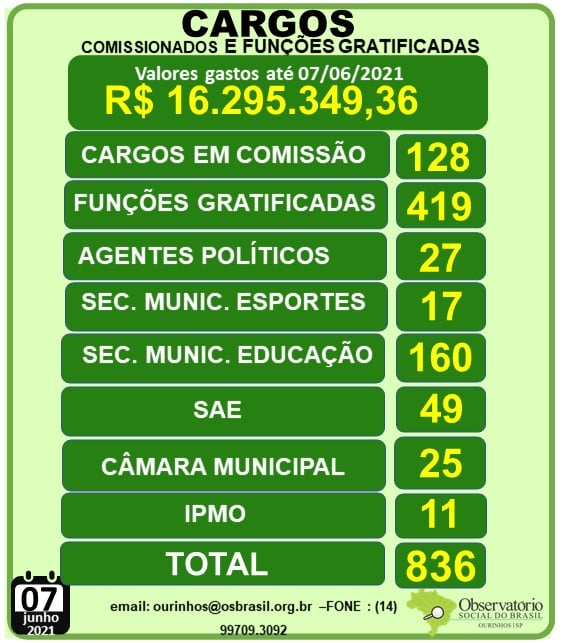 O Observatório Social de Ourinhos atualizou nesta segunda-feira, 7, o que ficou conhecido como o “Boletim de Cargos”, que divulga os gastos com os Cargos Comissionados e “Funções de confiança”, na cidade e apontou que já foram consumidos nos cinco primeiros meses do ano a quantia de R$16.295.349,36, só com salários de 836 cargos nomeados tanto na Prefeitura de Ourinhos, Secretaria Municipal de Esportes, como na Câmara Municipal, SAE (Superintendência de Água e Esgoto de Ourinhos) e no IPMO (Instituto de Previdência do Município de Ourinhos).