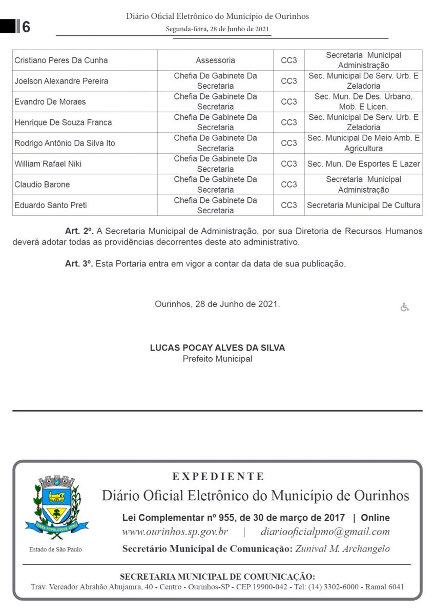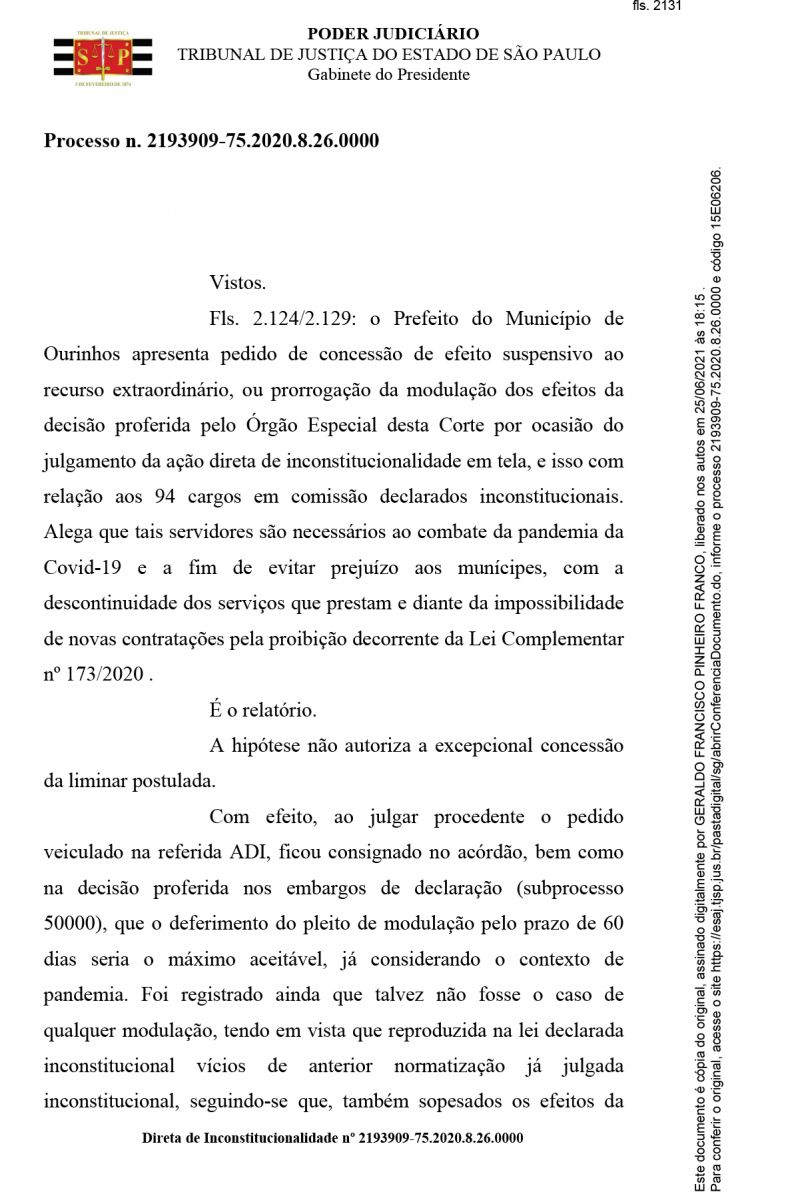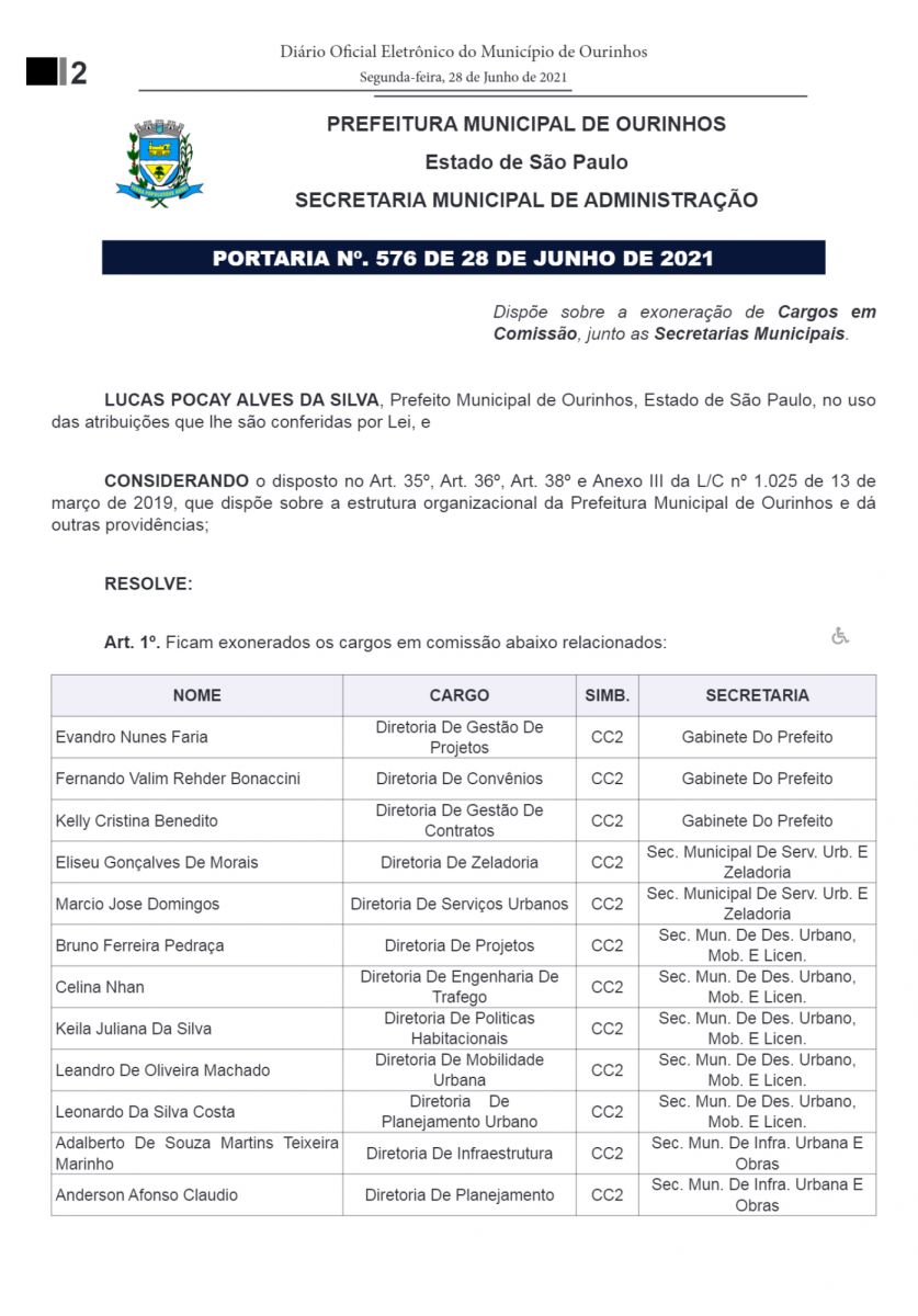Logo após os vereadores retirarem da pauta da sessão ordinária desta segunda-feira, 28, o projeto de Lei Completar 08/2021, do prefeito de Ourinhos Lucas Pocay (PSD), que pretendia alterar e acrescentar dispositivos à Lei nº 1.025, criando duas novas secretarias, de “Planejamento” e “Inclusão” e também a criação dos cargos de Assessor Especial e Assessor de Secretário / Adjunto, a Prefeitura de Ourinhos atendeu a justiça e exonerou os 94 cargos comissionados considerados ilegais. As exonerações foram publicadas no Diário Oficial.  Confira a decisão do Tribunal de Justiça, que recusou o recurso feito por Lucas Pocay, pedindo o adiamento da medida e a lista de todos os comissionados exonerados.