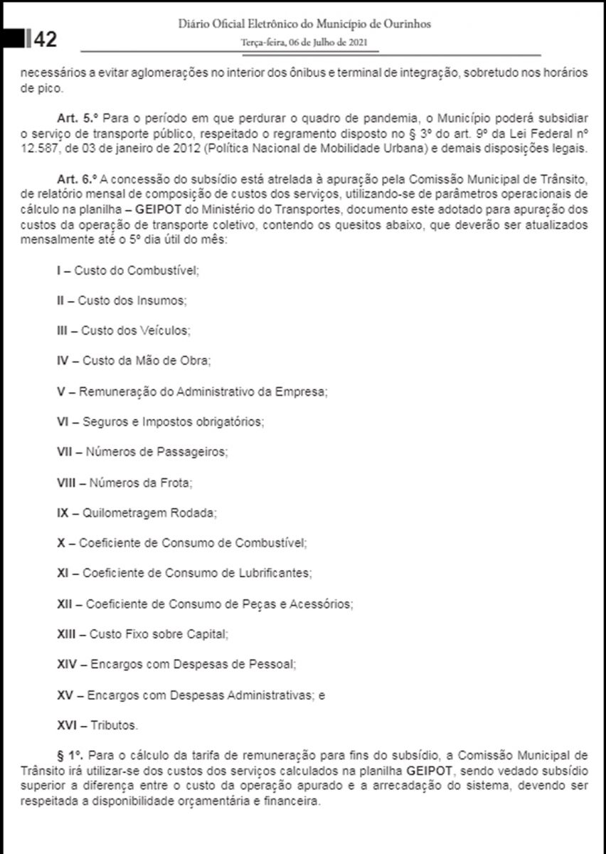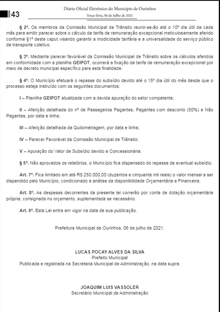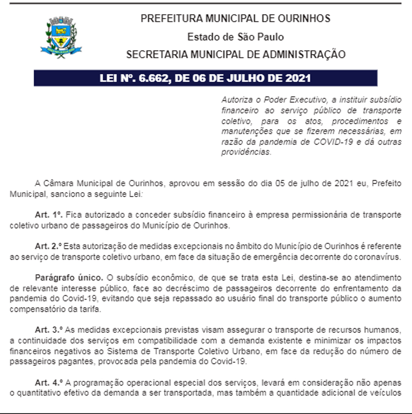 O prefeito de Ourinhos, Lucas Pocay (PSD) sancionou e publicou, nesta terça-feira, 6, no Diário Oficial do Município, a Lei 6.662 que autoriza o Poder Executivo, a instituir subsídio financeiro ao serviço público de transporte coletivo, para os atos, procedimentos e manutenções que se fizerem necessárias, em razão da pandemia da Covid-19. De acordo com a matéria, a Prefeitura de Ourinhos poderá repassar até R$250 mil por mês à concessionária do transporte coletivo, Circular Cidade de Ourinhos, até o fim da pandemia da Covid-19, para ajudar no impacto financeiro da empresa, porém, será preciso passar pelo “crivo” Comissão Municipal de Trânsito. Confira abaixo todos os detalhes da matéria: