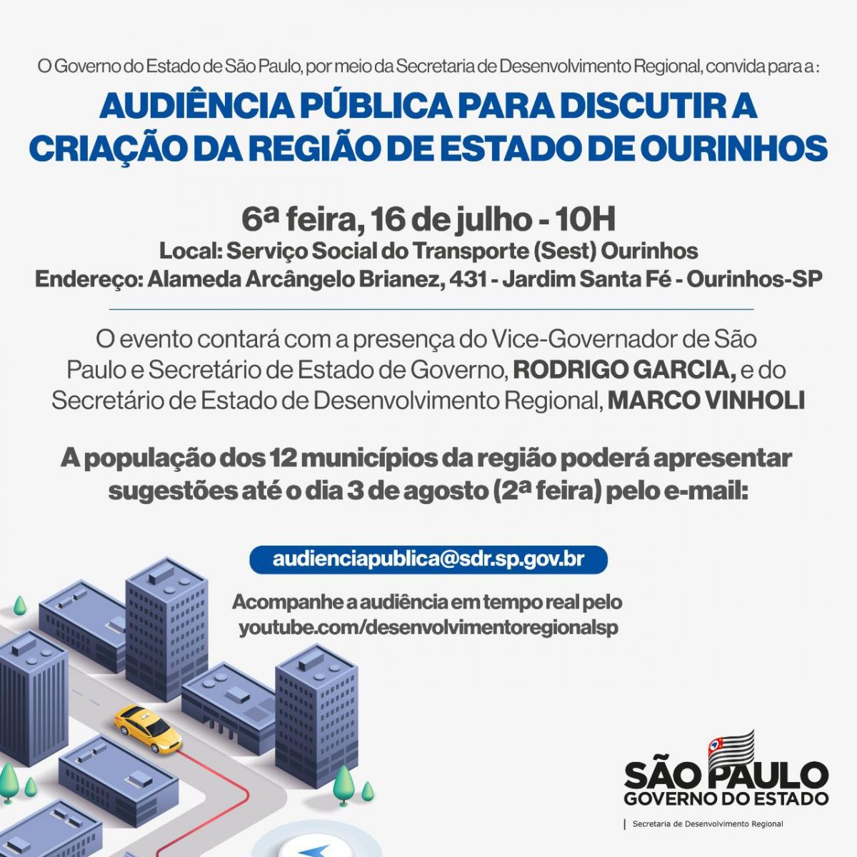 Sem nenhuma divulgação prévia, ou comunicação aos veículos de imprensa da cidade e região, o vice-governador, Rodrigo Garcia e o secretário estadual de Desenvolvimento Regional, Marco Antonio Scarasati Vinholi, estrão em Ourinhos, nesta sexta-feira, 16. Eles participarão de uma audiência pública, às 10h, no auditório do SEST/SENAT de Ourinhos, na Rua Alameda Arcângelo Brianez, 431, no Jardim Santa Fé, para discutir a criação da “Região do Estado de Ourinhos”. O que se sabe é que irão compor esta região 12 municípios, entre eles, Ourinhos, Santa Cruz do Rio Pardo, Ipaussu, São Pedro do Turvo, Ribeirão do Sul, Salto Grande, Timburi, Chavantes, Canitar, Campos Novos Paulista, Espirito Santo do Turvo, entre outros.