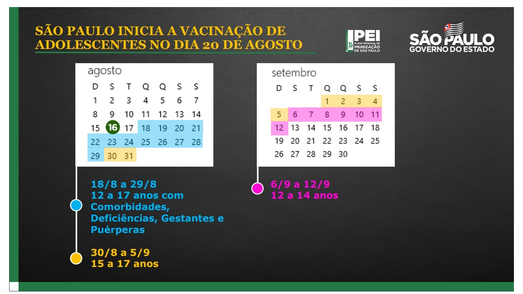 - Do dia 18 a 29 de agosto, serão vacinados adolescentes de 12 a 17 anos com comorbidades, deficiências, gestantes e puérperas;
