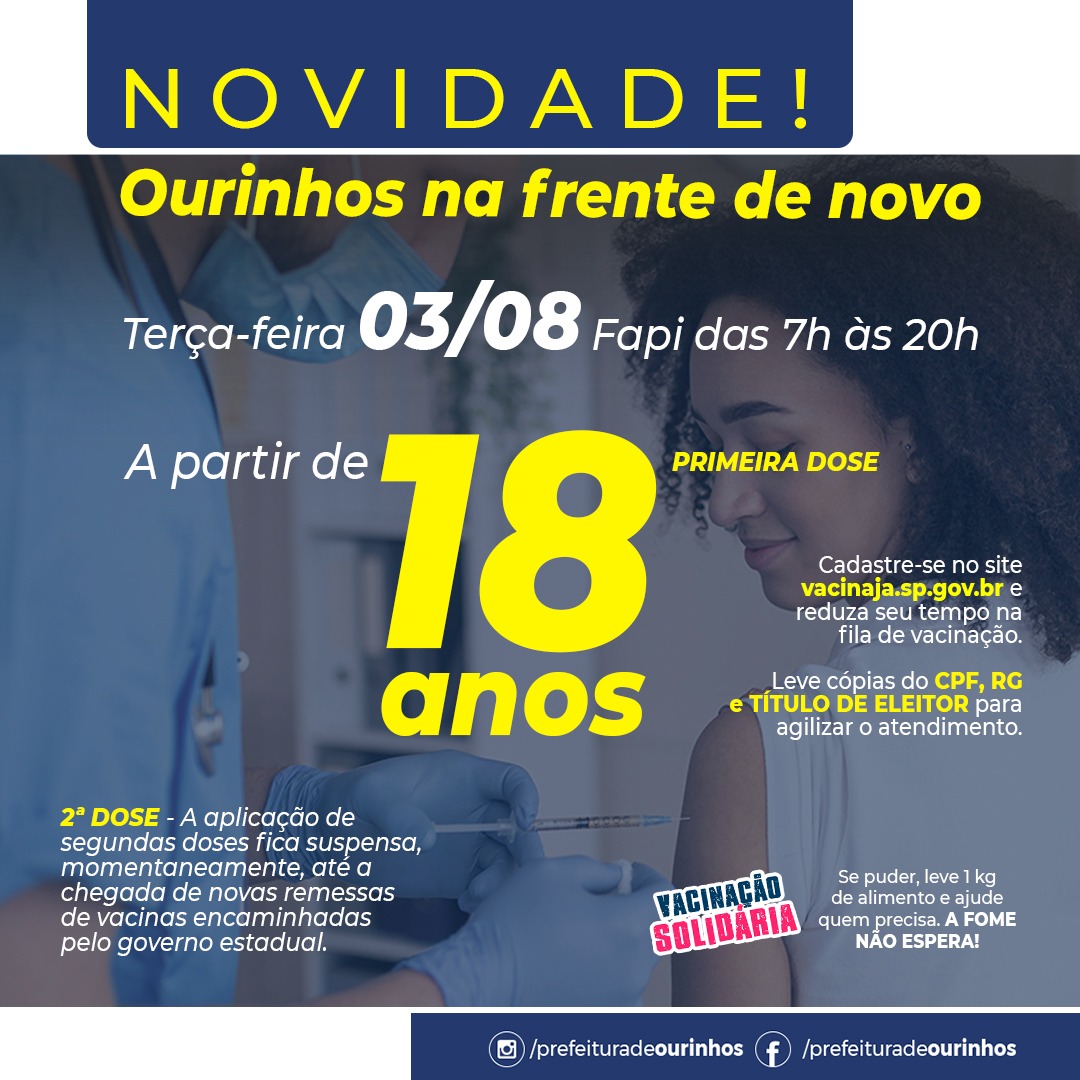 O prefeito de Ourinhos, Lucas Pocay, anunciou através de uma transmissão de vídeo ao vivo em sua rede social, que a cidade vai vacinar contra a Covid-19 jovens de 18 anos ou mais, a partir desta terça-feira, 2. A vacinação será na Fapi, das 7h às 20h.