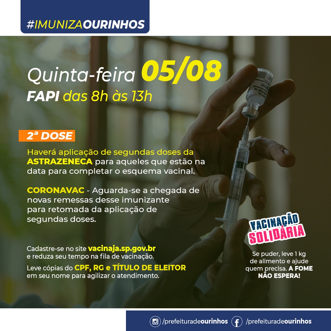 A Prefeitura de Ourinhos desacelerou completamente o ritmo da vacinação, após aplicar cerca de 5 mil doses nesta terça-feira, 3, em jovens de 18 anos ou mais e só vai vacinar, nesta quinta-feira, 5, idosos, que estão na hora de receber a 2ª dose da vacina da AstraZeneca/Oxford. Segundo a prefeitura, a 2ª dose da CoronaVac não será aplicada, por falta do imunizante. E para piorar, a vacinação acontece, praticamente, apenas no período da manhã, das 8h às 13h, sendo que na terça-feira a vacinação começou às 7h e foi até às 21h30.
