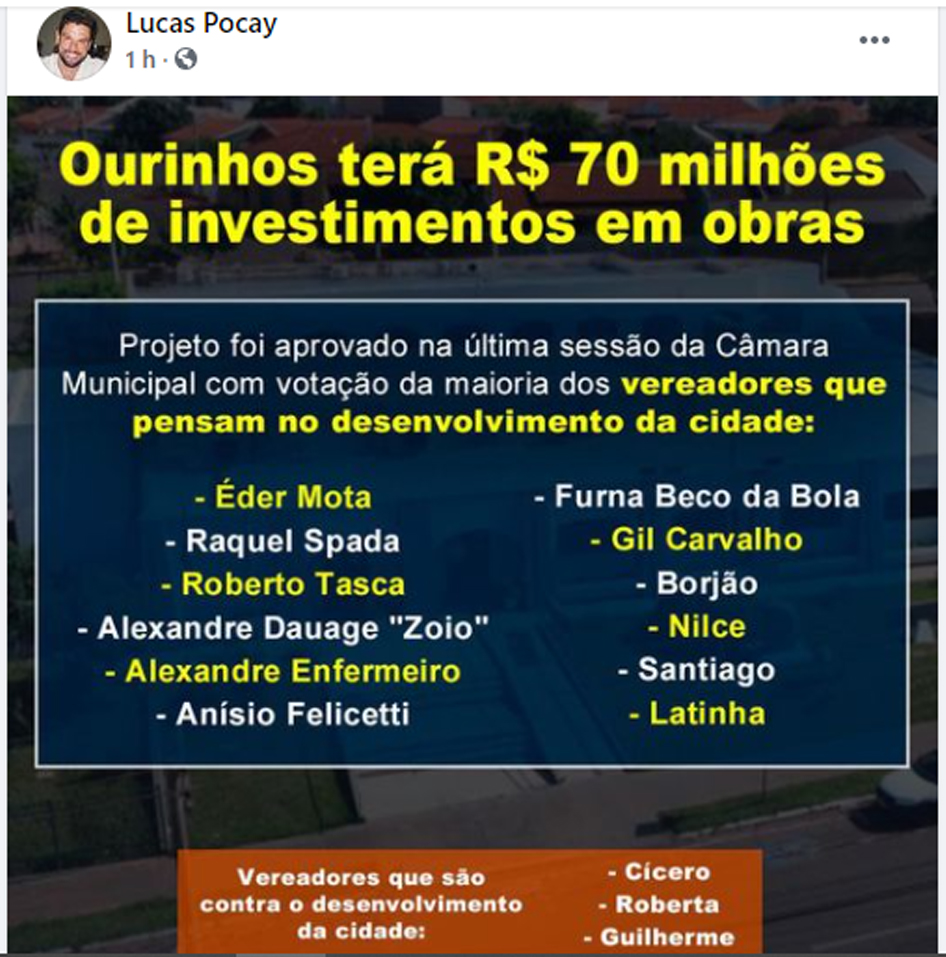 Mas parece que Lucas tem memória curta e esqueceu, que ele próprio era contra empréstimos bancários. Em 2012, quando era vereador, Lucas Pocay usou a tribuna para discursar contra o empréstimo de cerca de R$200 mil para investir na iluminação pública, mas hoje, em plena pandemia pode emprestar R$70 milhões. (veja o vídeo abaixo)