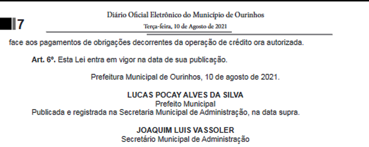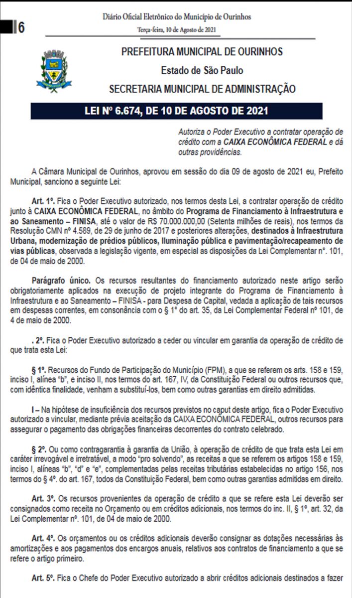 Depois dos vereadores da base do prefeito de Ourinhos Lucas Pocay (PSD) aprovarem, na calada da noite, sem qualquer discussão, foi publicado, nesta terça-feira, 10, no Diário Oficial do Município, a Lei nº 6.674 de 10 agosto de 2021, que “Autoriza o Poder Executivo a contratar operação de crédito com a CAIXA ECONÔMICA FEDERAL”. Lucas Pocay poderá fazer uma dívida em nome da Prefeitura de Ourinhos, de até R$70 milhões, através do “Programa de Financiamento à Infraestrutura e ao Saneamento – FINISA”, que deverão ser destinados à Infraestrutura Urbana, modernização de prédios públicos, Iluminação pública e pavimentação/recapeamento de vias públicas. Confira a Lei abaixo: