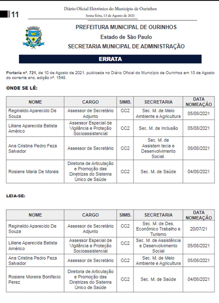 Já são ao todo 65 apaniguados que voltaram para folha de pagamentos da Prefeitura de Ourinhos, pouco mais de um mês depois de serem dispensados por estarem em cargos considerados ilegais (clique e relembre a última nomeação). Além das três novas nomeações, Lucas publicou uma errata com nomeações que houve equívocos, que haviam sido feitas na última terça-feira, 10. (confira abaixo)