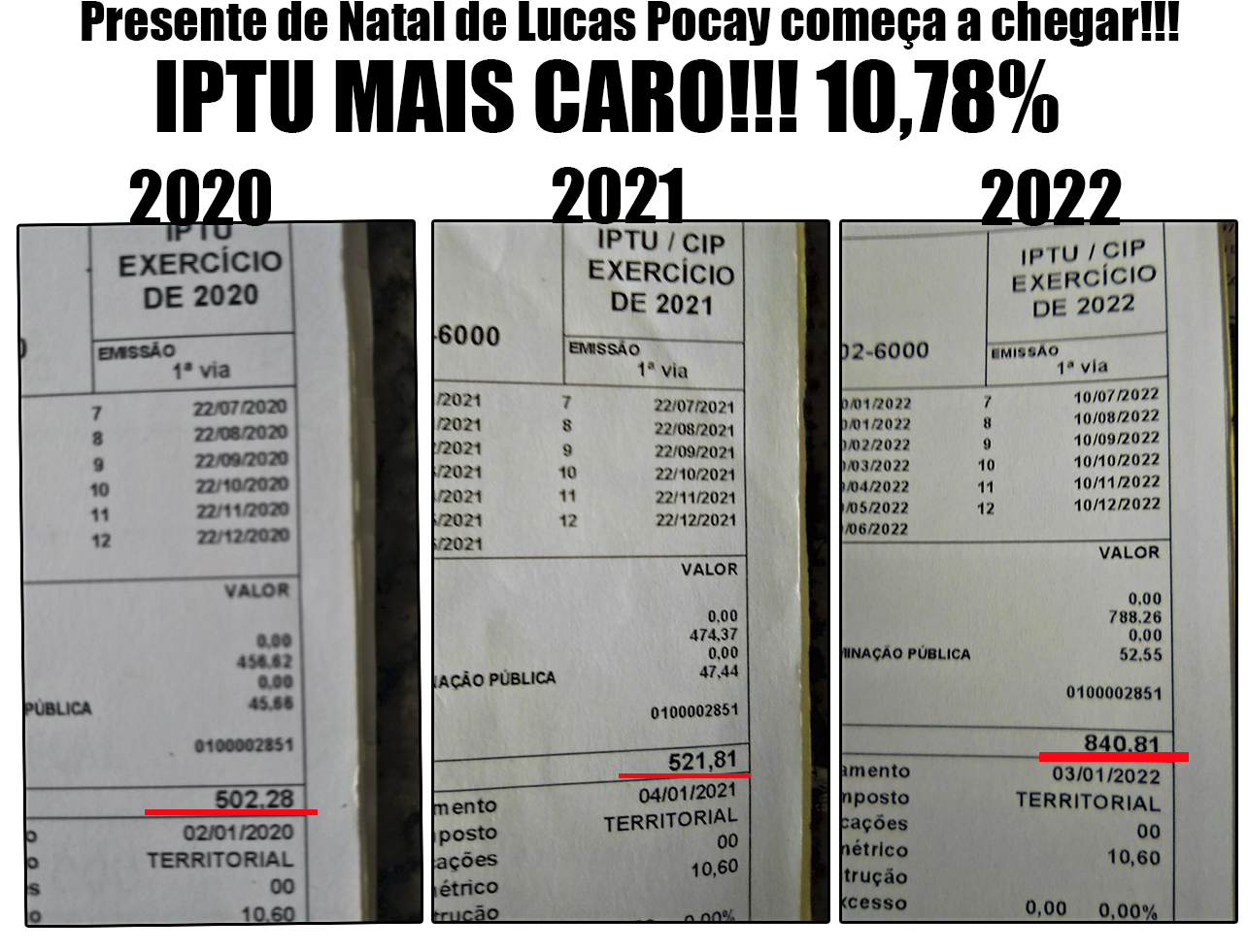 Estes reajustes passam a vigorar no dia 1º de janeiro de 2022. Uma munícipe enviou ao Passando a Régua carnês dos dois últimos anos e o novo, com vencimento já para o dia 3 de janeiro. O aumento absurdo fica evidente: