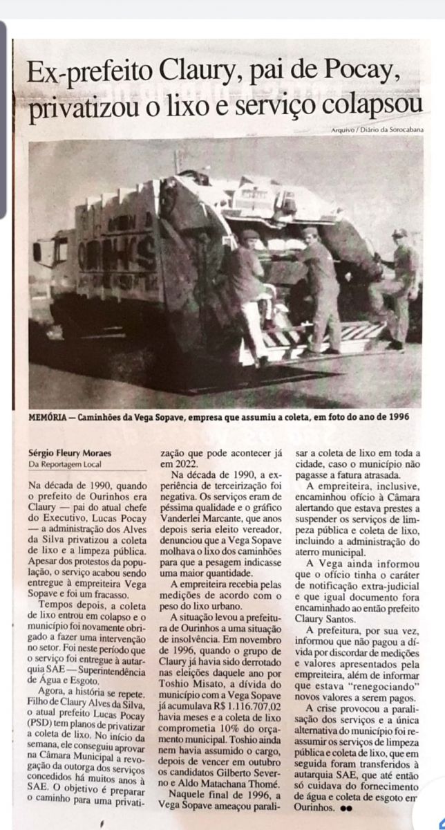 Porém, a questão salarial, que não deveria entrar em discussão, é apenas usada, tanto pelo prefeito (com salário de R$21.989, 25), como pelo superintendente da SAE (Superintendência de Água Esgoto de Ourinhos), Inácio J. B. Filho (com salário de R$12.150,00), para tentar desqualificar o movimento grevista dos coletores, que sempre deixaram claro que o grande problema da transferência do serviço de coleta de lixo para a Prefeitura é a possibilidade de terceirização, que nunca foi negada por ambos os governantes. Aliás, em recente matéria publicada pelo Jornal Debate de Santa Cruz do Rio Pardo, foi lembrado, que na década de 90, quando o prefeito de Ourinhos era o pai de Lucas, Claury Alves da Silva, foi exatamente isso que aconteceu, a coleta de lixo era terceirizada, realizada pela empresa Vega Sopave, que prestava um péssimo serviço. Só depois que se encerrou o mandato de Claury, que o então prefeito Toshio Misato levou os serviços de limpeza para a SAE, em 1997. (confira a matéria abaixo)