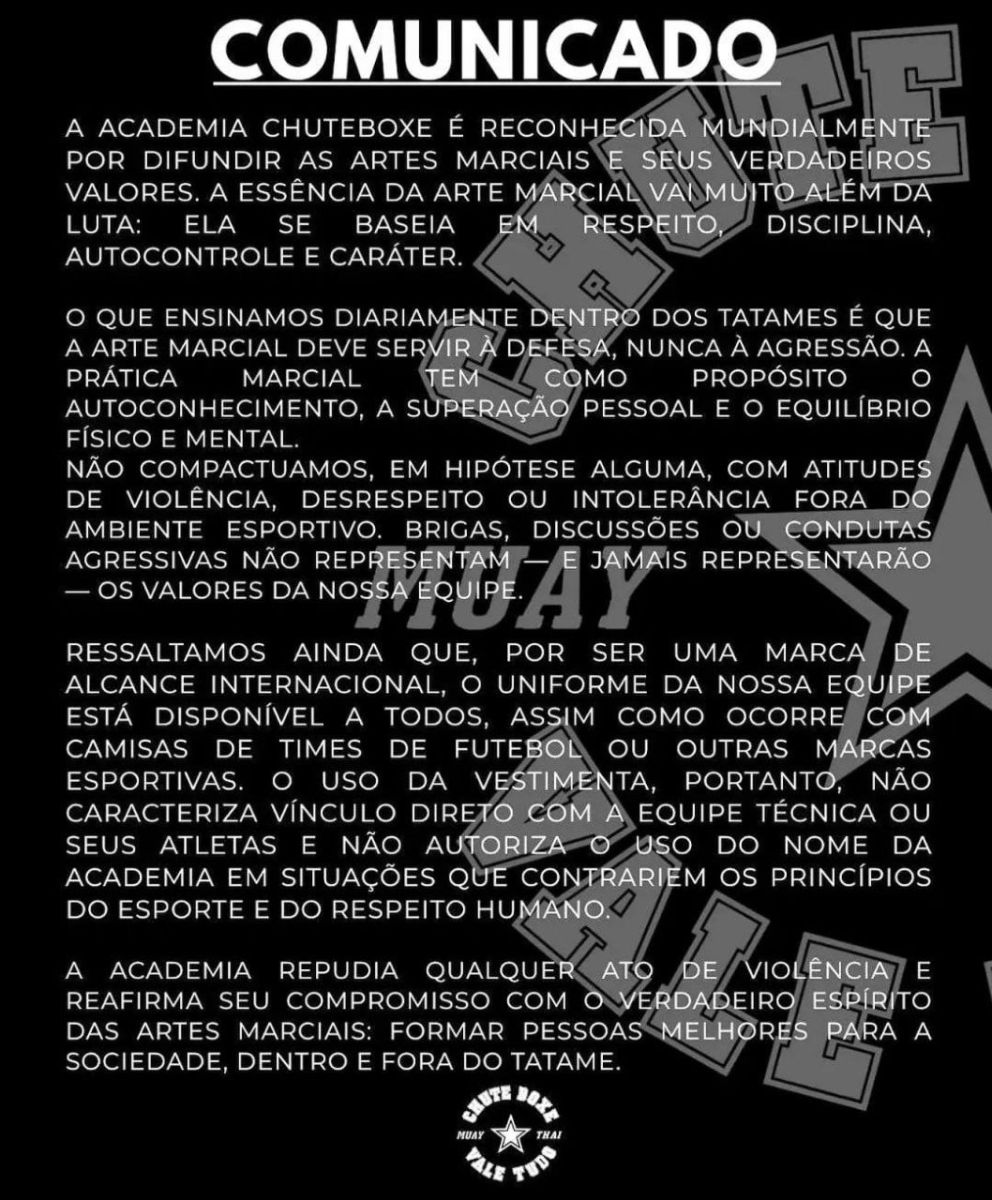 No posicionamento, a Chute Boxe destacou que é uma marca reconhecida internacionalmente pela difusão das artes marciais e de seus valores fundamentais, como respeito, disciplina, autocontrole e caráter. A academia afirmou que não compactua, em nenhuma hipótese, com atitudes de violência, agressão ou desrespeito fora do ambiente esportivo, reforçando que a prática marcial deve servir à defesa e ao desenvolvimento pessoal, jamais à agressão.