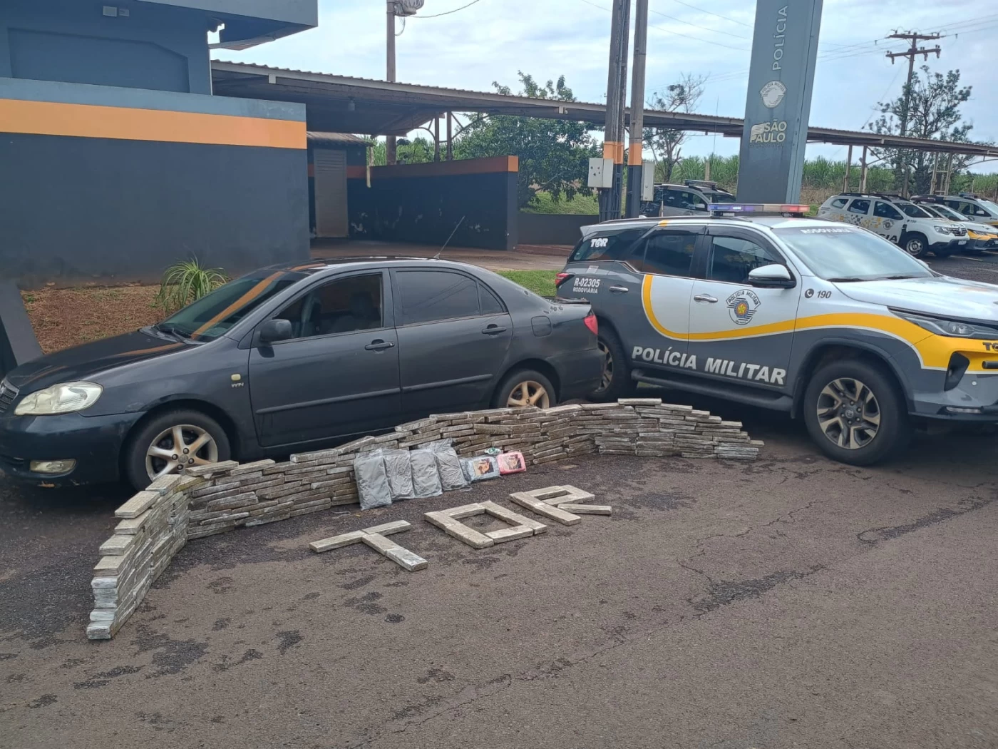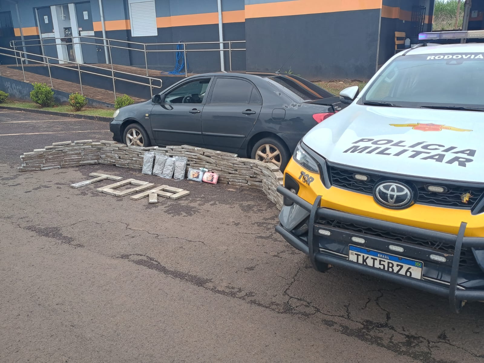 Os policiais abordaram um Toyota/Corolla ocupado por um homem de 29 anos e uma adolescente de 17 anos, ambos moradores do Paraná. Durante a fiscalização, a equipe encontrou no porta-malas do veículo diversos tabletes de entorpecentes embalados em plástico.