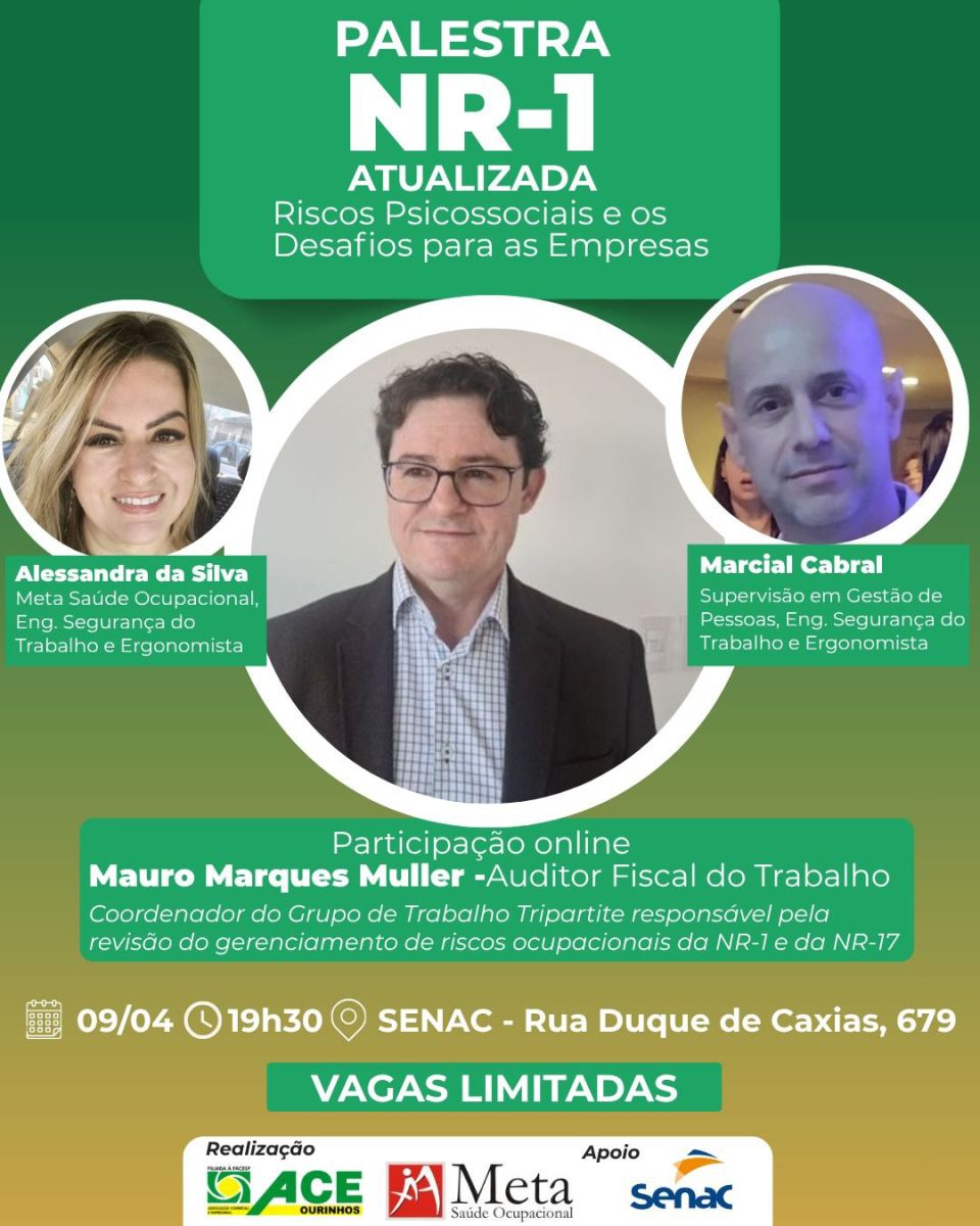 Com o objetivo de levar conhecimento e preparar as empresas para as novas exigências do ambiente de trabalho, a Associação Comercial e Empresarial de Ourinhos (ACE) promove no próximo dia 09 de abril, às 19h30, no Senac Ourinhos, a palestra “NR-1 Atualizada: Riscos Psicossociais e os Desafios para as Empresas”.