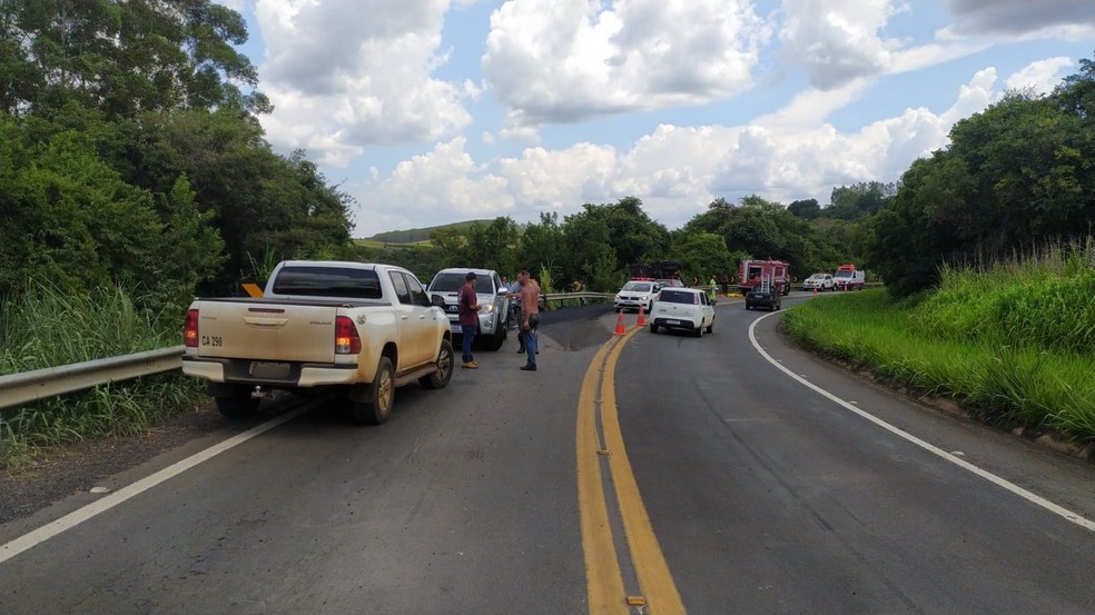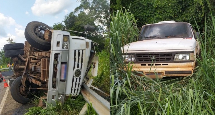 Segundo o Corpo de Bombeiros, um caminhão carregado com massa asfáltica bateu em uma caminhonete, no início da tarde. Por conta do impacto, os dois veículos tombaram no acostamento da rodovia.