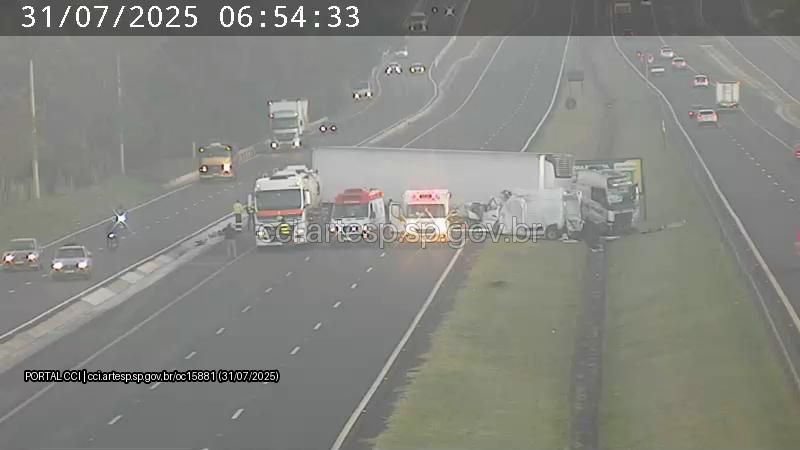 Após o impacto, a van (V-01) foi parar no canteiro central da rodovia. O caminhão com etanol (V-02) permaneceu imobilizado na faixa 1, e o caminhão com carne (V-03) parou entre as faixas 1 e 2 da via.
