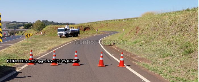 Equipes da concessionária estão no local e, segundo atualização feita às 14h35, uma equipe técnica de engenharia foi acionada para avaliar a estrutura do dispositivo atingido. A previsão de liberação do tráfego depende dessa análise e dos reparos necessários.