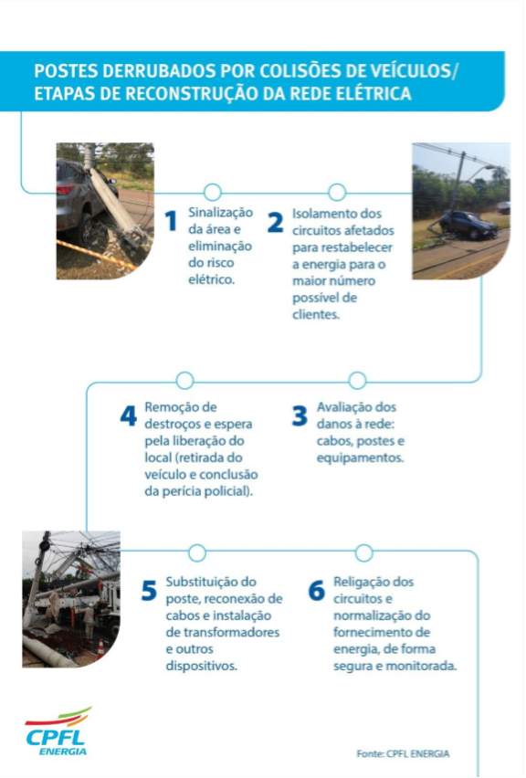 O trabalho é dividido em duas etapas: primeiro, remoção dos riscos e restabelecimento da energia para a maioria dos clientes; depois, os reparos necessários. “Apesar da pronta resposta das nossas equipes, em muitos casos é também necessário aguardar a perícia policial e a retirada do veículo para que possamos iniciar os trabalhos”, explica Ariley.