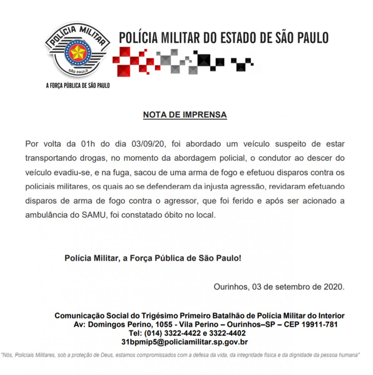 A Polícia Militar, através da Comunicação Social do Trigésimo Primeiro Batalhão de Polícia Militar do Interior emitiu uma nota sobre o ocorrido: