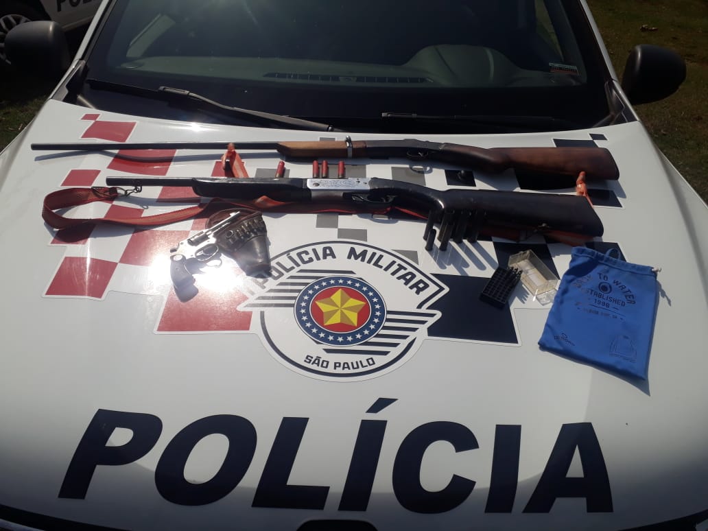 Ontem, 9, equipe de policias militares, durante atendimento de ocorrência de violência doméstica, pela área rural de São Pedro do Turvo, localizaram pela residência do agressor 2 espingardas, uma cal 36 com 7 cartuchos, outra cal 28 com 3 cartuchos e 1 revólver cal 22 com 14 munições.