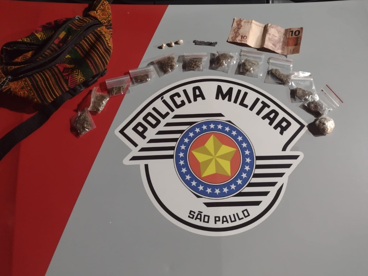 Em revista a pochete que ela estava portando, foram localizadas 12 porções de maconha, 03 pedras de crack, uma lâmina cortante e R$10,00 (dez reais) em dinheiro. Diante da materialidade constadas, permaneceu à disposição da Justiça.
