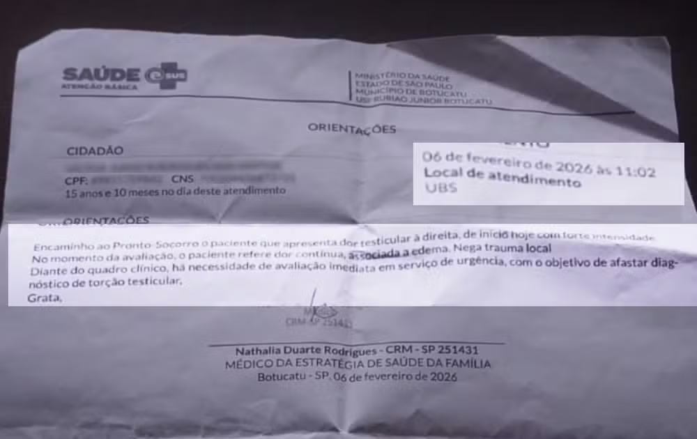 Segundo a mãe do jovem, Claudineia Rodrigues dos Santos, o filho começou a sentir fortes dores nos testículos por volta das 7h da sexta-feira (6), enquanto estava em casa. Por volta das 11h, ele procurou sozinho a Unidade de Saúde da Família de Rubião Júnior, distrito de Botucatu. Após suspeita de torção testicular — condição considerada emergência médica, pois pode levar à perda do órgão se não tratada rapidamente — a equipe acionou a mãe e encaminhou o adolescente ao Pronto-Socorro Adulto para exames complementares.