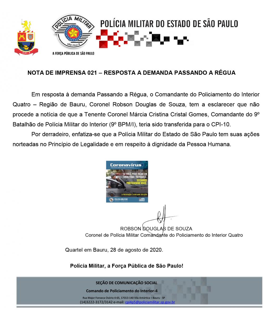 O Passando a Régua procurou a Polícia Militar, que através do Comandante do Policiamento do Interior 4, em Bauru, respondeu a informação de que a transferência não procede. A nota é assinada pelo Comandante Robson Douglas de Souza.