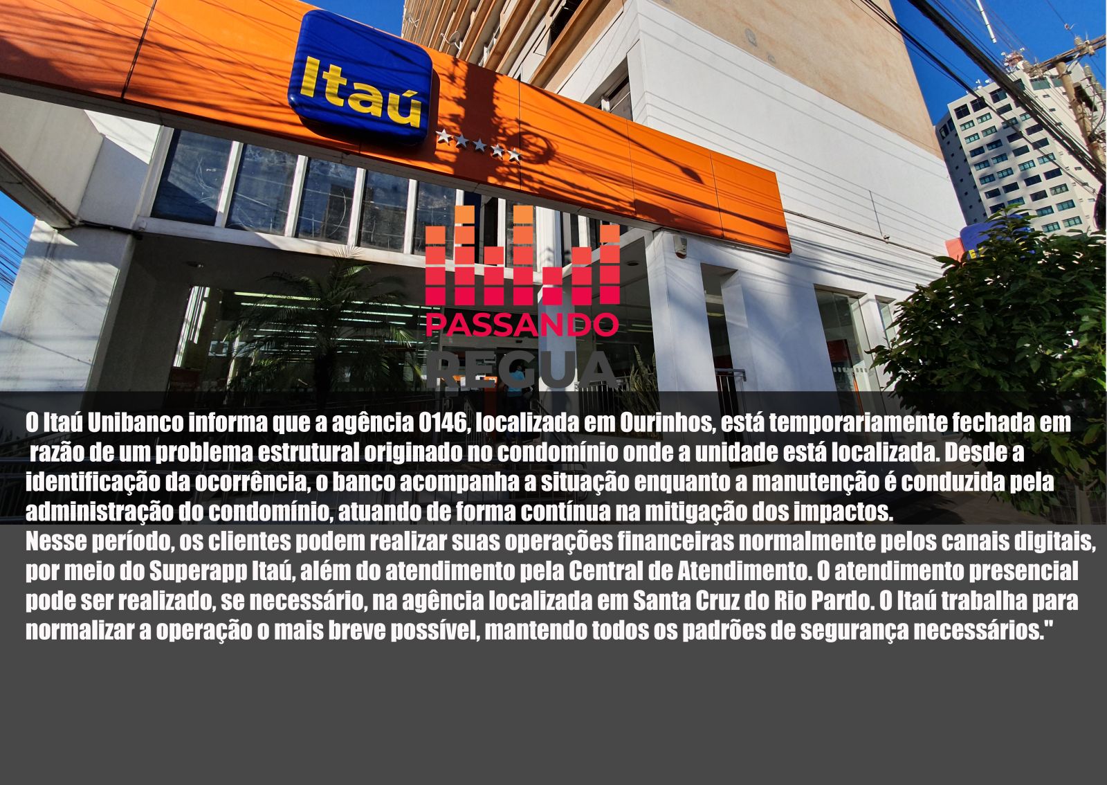 "O Itaú Unibanco informa que a agência 0146, localizada em Ourinhos, está temporariamente fechada em razão de um problema estrutural originado no condomínio onde a unidade está localizada. Desde a identificação da ocorrência, o banco acompanha a situação enquanto a manutenção é conduzida pela administração do condomínio, atuando de forma contínua na mitigação dos impactos.