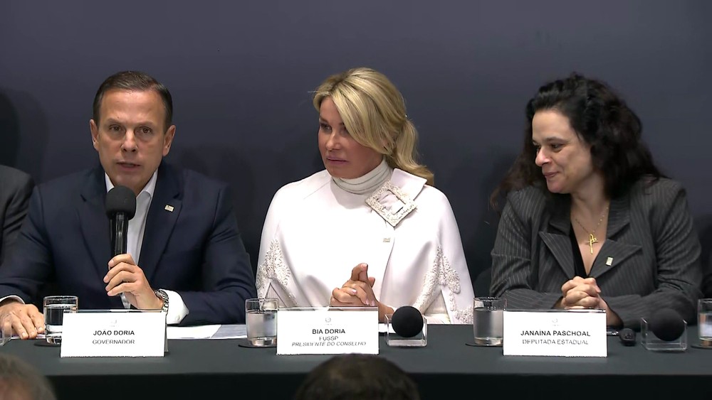 O governador João Doria (PSDB) sanciona lei da deputada Janaína Paschoal (PSL) sobre cesáreas no SUS — Foto: Reprodução/TV Globo