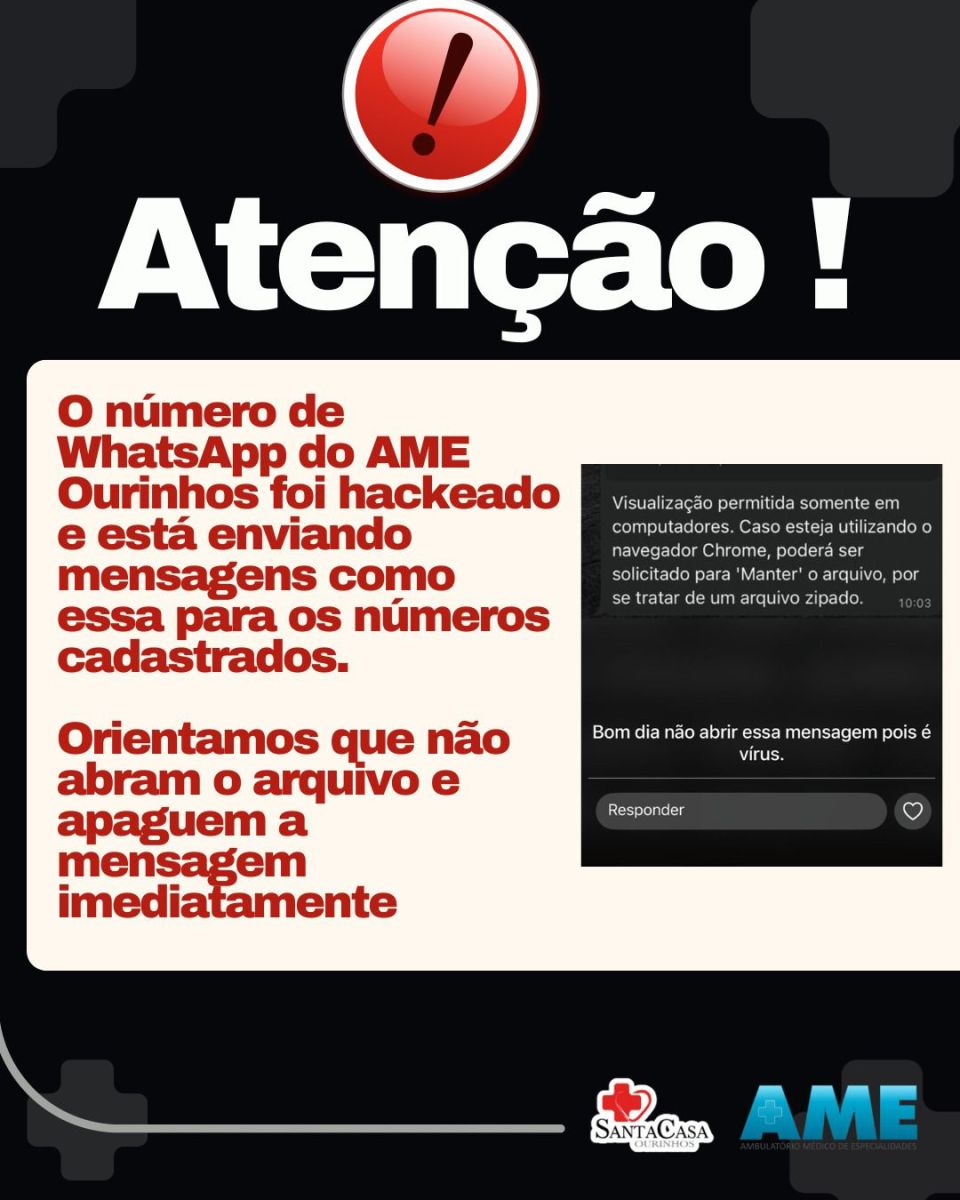 “O número de WhatsApp do AME Ourinhos foi hackeado e está enviando mensagens fraudulentas. Orientamos que não abram o arquivo, apaguem a mensagem imediatamente e não cliquem em nenhum link.”