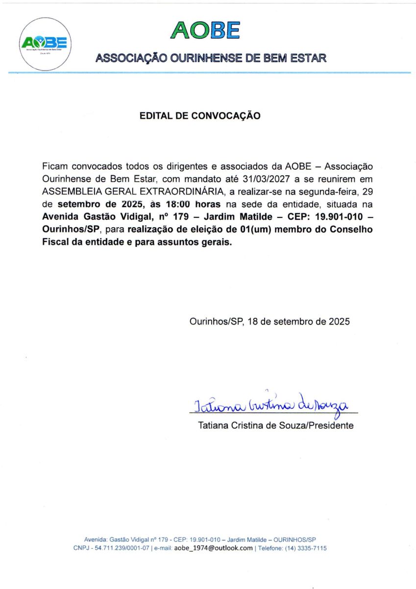 Ficam convocados todos os dirigentes e associados da AOBE – Associação Ourinhense de Bem Estar, com mandato até 31/03/2027 a se reunirem em ASSEMBLEIA GERAL EXTRAORDINÁRIA, a realizar-se na segunda-feira, 29 de setembro de 2025, as 18:00 horas na sede da entidade, situada na Avenida Gastão Vidigal, n° 179 - Jardim Matilde - CEP: 19.901-010 - Ourinhos/SP, para realização de eleição de 01(um) membro do Conselho Fiscal da entidade e para assuntos gerais.