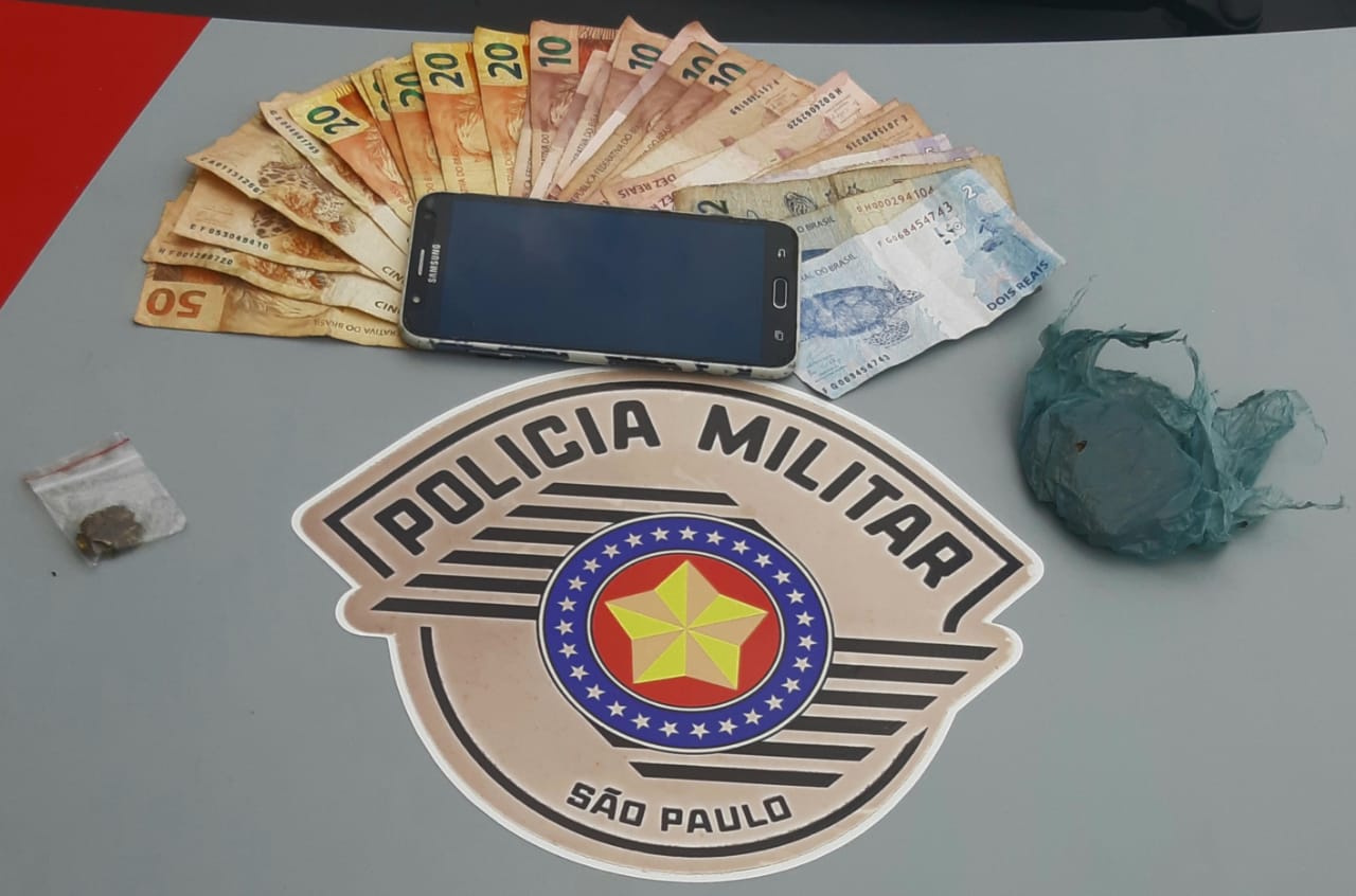 Ao ser submetido a busca pessoal, foi localizado no bolso da bermuda um frasco contendo 4 porções de maconha já prontas e embaladas pra venda, além de um epenforff contendo cocaína e R$ 41,00 notas diversas.