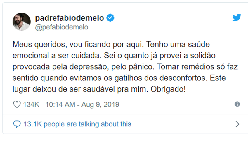 Após conquistar sete milhões de fãs, o Padre Fábio de Melo decidiu abandonar o Twitter nesta sexta-feira (9). Ele recebeu muitos comentários negativos após criticar a "saidinha" de Dia dos Pais de Alexandre Nardoni.